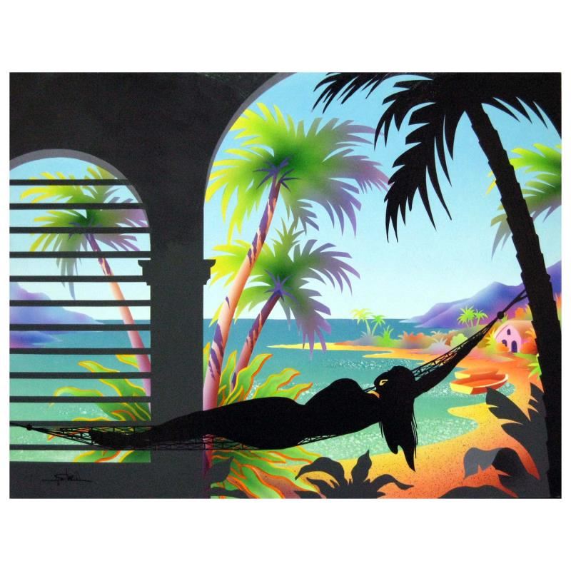 "Miranda On The Veranda" is an original painting, acrylic on board. The piece comes hand signed and with a certificate of authenticity. Measures approximately 18" x 22" (image).