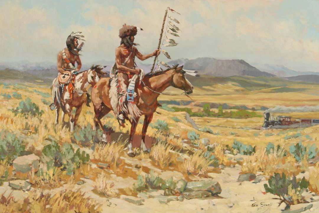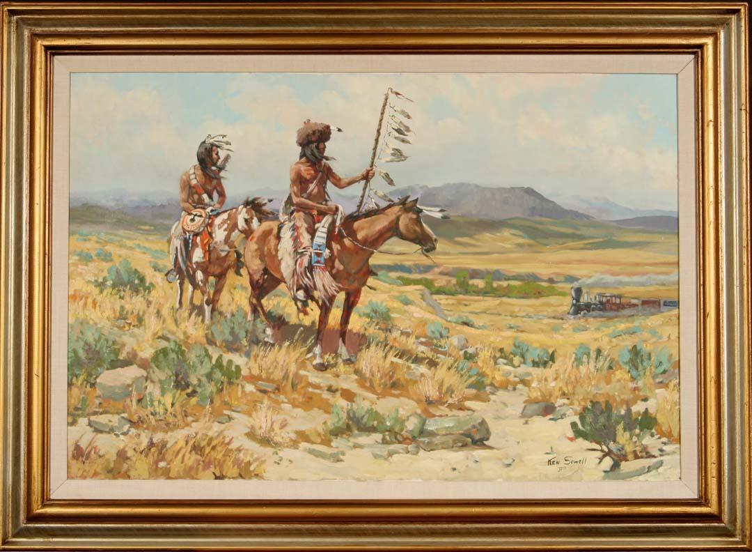Ken Sowell (20th Century). Return Of The Iron Horse. 24" x 36" oil on canvas. Signed lower right. (est $2,000-3,000). For condition reports please visit: www.auctioninsantafe.com/cr2011.pdf