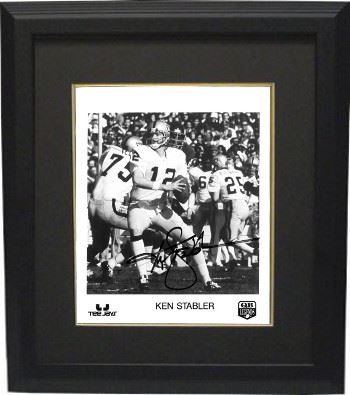 Ken Stabler was drafted in the second round of the 1968 NFL Draft by the Oakland Raiders. As a starter in Oakland, Stabler was named AFC player of the year in 1974 and 1976, and was the NFL's passing champion in 1976. In January 1977 he guided the Raiders to their first Super Bowl victory, a dominating 32-14 win over the Minnesota Vikings. Ken has hand signed this Oakland Raiders 8x10 Photo. Certificate of Authenticity from Athlon Sports Collectibles. Custom Black Mat and Premium Black Color Framed as shown.