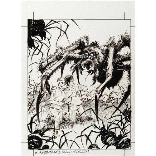 Harry Potter and Ron Weasley face the horrifying Aragog and his hairy multitude, in this illustration for the card, "In the Spider's Lair," by Ken Steacy (Card #31/140). Rendered in pen and ink and crayon on heavy illustration board, the image area measures 7.5" x 9.5". In Excellent condition. Signed by Ken Steacy at the left.<BR><BR><b>Shipping:</b> Small Flat (<a target="_blank" href="http://www.heritageauctions.com/common/shipping.php">view shipping information</a>)