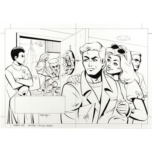 J. Jonah Jameson does what he does best -- rant -- at Peter Parker, in these two pages from this "Tattoo-Me Storybook." Both pages are on one sheet, illustrated by Ken Steacy. The image area measures approximately 15" x 10", and the art is in Excellent condition. Signed by Ken Steacy at the bottom left.<BR><BR><b>Shipping:</b> Small Flat (<a target="_blank" href="http://www.heritageauctions.com/common/shipping.php">view shipping information</a>)