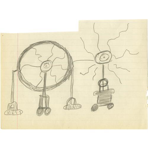 <B>Two Kenneth Strickfaden Drawings of Frankenstein Electrical Equipment.</B></I> Creating and operating the electrical gadgetry for Universal's Frankenstein series was more than a job for Kenneth Strickfaden - it was a consuming passion. These two pencil sketches of "mad laboratory" props, drawn and saved by Strickfaden, prove how much he loved his work and how obsessive it was for him. The two sketches, one 4" x 4.5" and the other 5.5" x 7.5," are fascinating mementoes of this special effects genius. Excellent condition.<BR><BR><b>Shipping:</b> Flat Material, Small (<a target="_blank" href="http://www.heritageauctions.com/common/shipping.php">view shipping information</a>)
