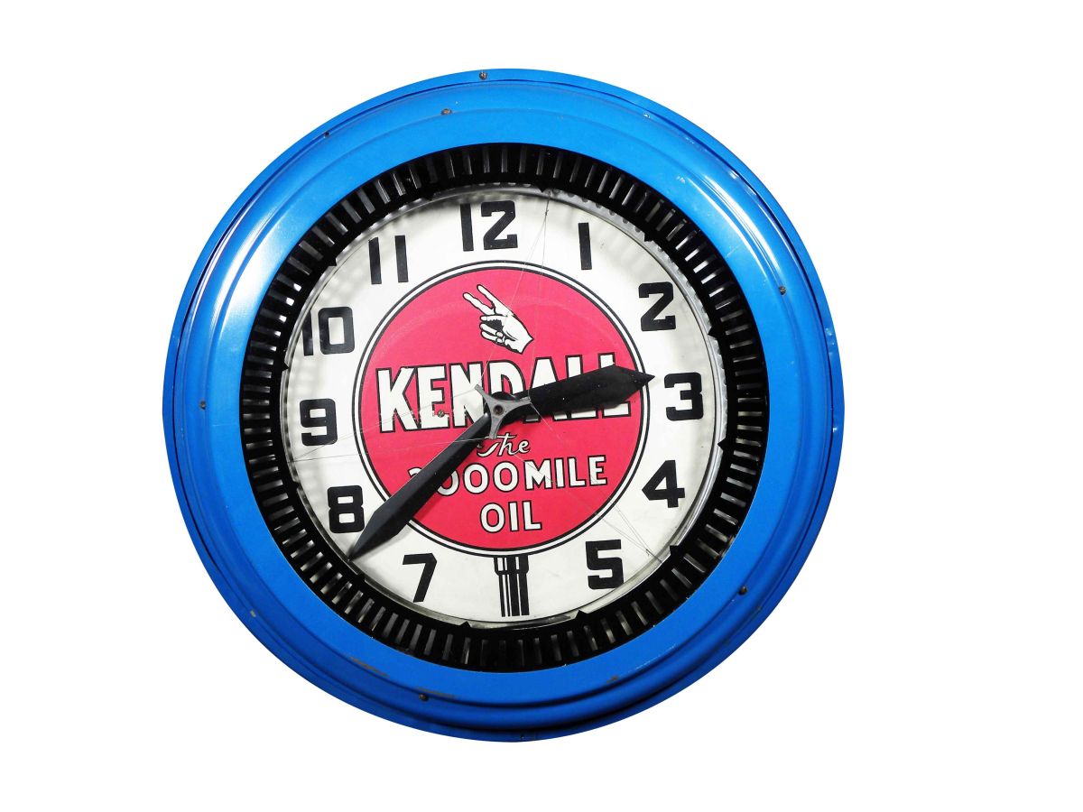 Kendall 2000 Mile Oil Spinner Clock. Very good working condition. 22 inch diameter.