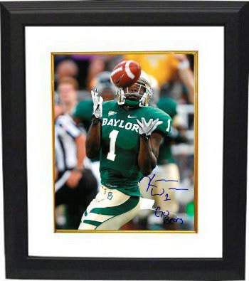 As a true freshman in 2008, Kendall Wright played in all 12 games and led the team in receptions with 50, receiving yards with 649 yards and five touchdowns. The 50 receptions and 649 receiving yards were Baylor freshman records. As a sophomore in 2009, Wright again was the teams leading receiver with 66 receptions for 740 yards and five touchdowns. He was a All-Big 12 honorable mention. As a junior in 2010, he was named a second team All-Big 12 selection after recording 78 receptions for 952 yards and seven touchdowns. The 78 receptions set a school record for most receptions in a season. In his senior season, Wright played in all 13 games and had 108 receptions for 1,633 yards with 14 touchdowns. Wright was named 1st Team All-American and All-Big 12. Kendall Wright has hand signed this Baylor Bears 8x10 Photo with Go Bears inscription. Certificate of Authenticity from Athlon Sports. Custom White Mat and Premium Black Frame as shown.