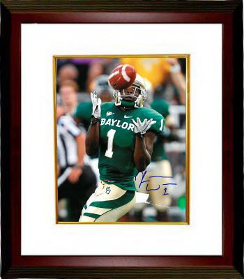 As a true freshman in 2008, Kendall Wright played in all 12 games and led the team in receptions with 50, receiving yards with 649 yards and five touchdowns. The 50 receptions and 649 receiving yards were Baylor freshman records. As a sophomore in 2009, Wright again was the teams leading receiver with 66 receptions for 740 yards and five touchdowns. He was a All-Big 12 honorable mention. As a junior in 2010, he was named a second team All-Big 12 selection after recording 78 receptions for 952 yards and seven touchdowns. The 78 receptions set a school record for most receptions in a season. In his senior season, Wright played in all 13 games and had 108 receptions for 1,633 yards with 14 touchdowns. Wright was named 1st Team All-American and All-Big 12. Kendall Wright has hand signed this Baylor Bears 8x10 Photo. Certificate of Authenticity from Athlon Sports. Custom White Mat and Premium Mahogany Frame as shown.