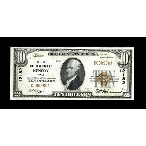 <B>Kenedy, TX</B></I> - $10 1929 Ty. 1 <B>The First NB</B></I> Ch. # 12182<BR>An attractive Karnes County note which appears new until closely inspected, when a couple of light folds can be discerned. Bright <B>Extremely Fine.</B></I><BR><BR><b>Shipping:</b> Coin/Currency (<a target="_blank" href="http://www.heritageauctions.com/common/shipping.php">view shipping information</a>)