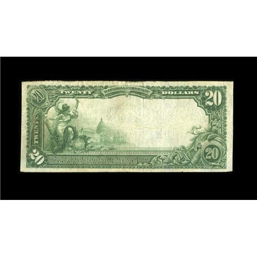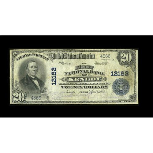 <B>Kenedy, TX</B></I> - $20 1902 Plain Back Fr. 661 <B>The First NB</B></I> Ch. # 12182<BR>After operating for ten years, this bank closed on March 22, 1932, was assumed by the Nichols NB, and opened the same day as the First-Nichols NB. Fraying can be found on the top of this example. <B>Fine.</B></I>