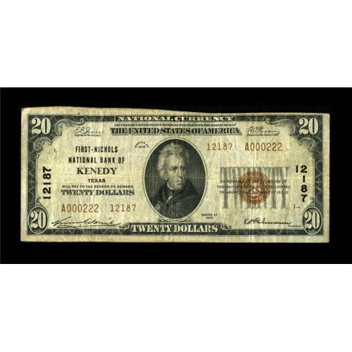 <B>Kenedy, TX</B></I> - $20 1929 Ty. 2 <B>First-Nichols NB</B></I> Ch. # 12187<BR> This becomes only the second Type 2 $20 to be documented on this bank. In May 2003 we sold a Type 2 $10 in a similar grade on this charter number for almost $750. <B>Fine.</B></I><BR><BR><b>Shipping:</b> Coins & Currency (<a target="_blank" href="http://www.heritageauctions.com/common/shipping.php">view shipping information</a>)