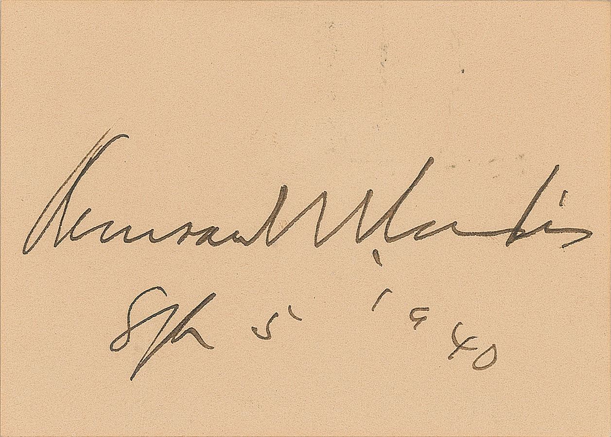 Vintage ink signature, "Kenesaw M. Landis, Sep. 5, 1940,” on an off-white 3.5 x 2.5 . In fine condition. Originates from the collection of John Mitchell.