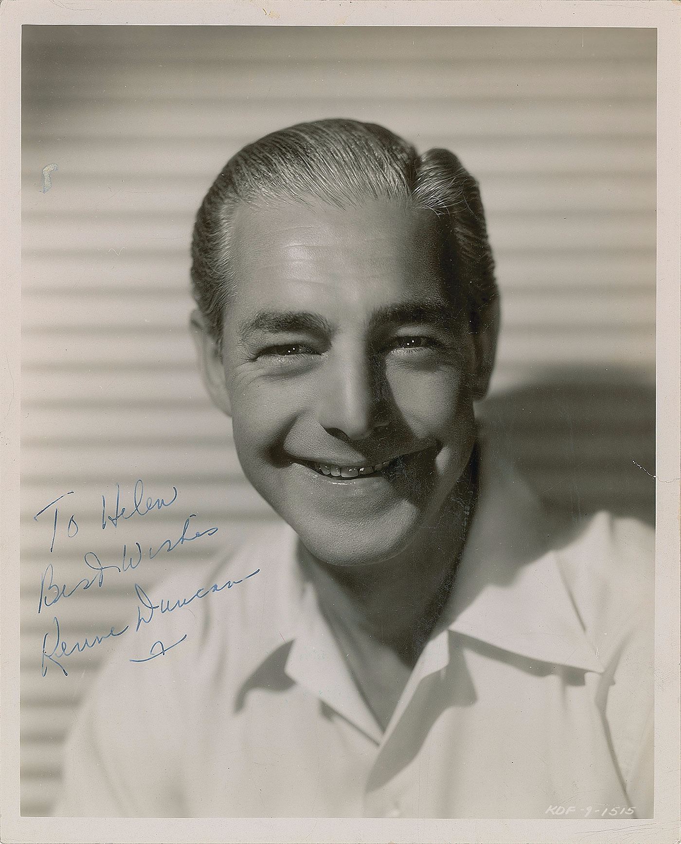 Canadian-born character actor (1903–1972) who is best remembered for making countless Western films and for starring in five productions by cult filmmaker Ed Wood. Vintage glossy 8 x 10 photo of Duncan with a bright smile, signed and inscribed in black ink, "To Helen, Best wishes, Kenne Duncan.” Reverse bears a Republic Studios photography stamp for Roman Freulich, as well as collector's ink notations indicating that the signature was obtained at the Family Theatre in Port Huron, Michigan, on September 17, 1947. In very good to fine condition, with scattered light overall creasing, a long light vertical crease passing through Duncan's facial area, and a short tear to the right edge. The first Duncan-signed item we have ever offered.