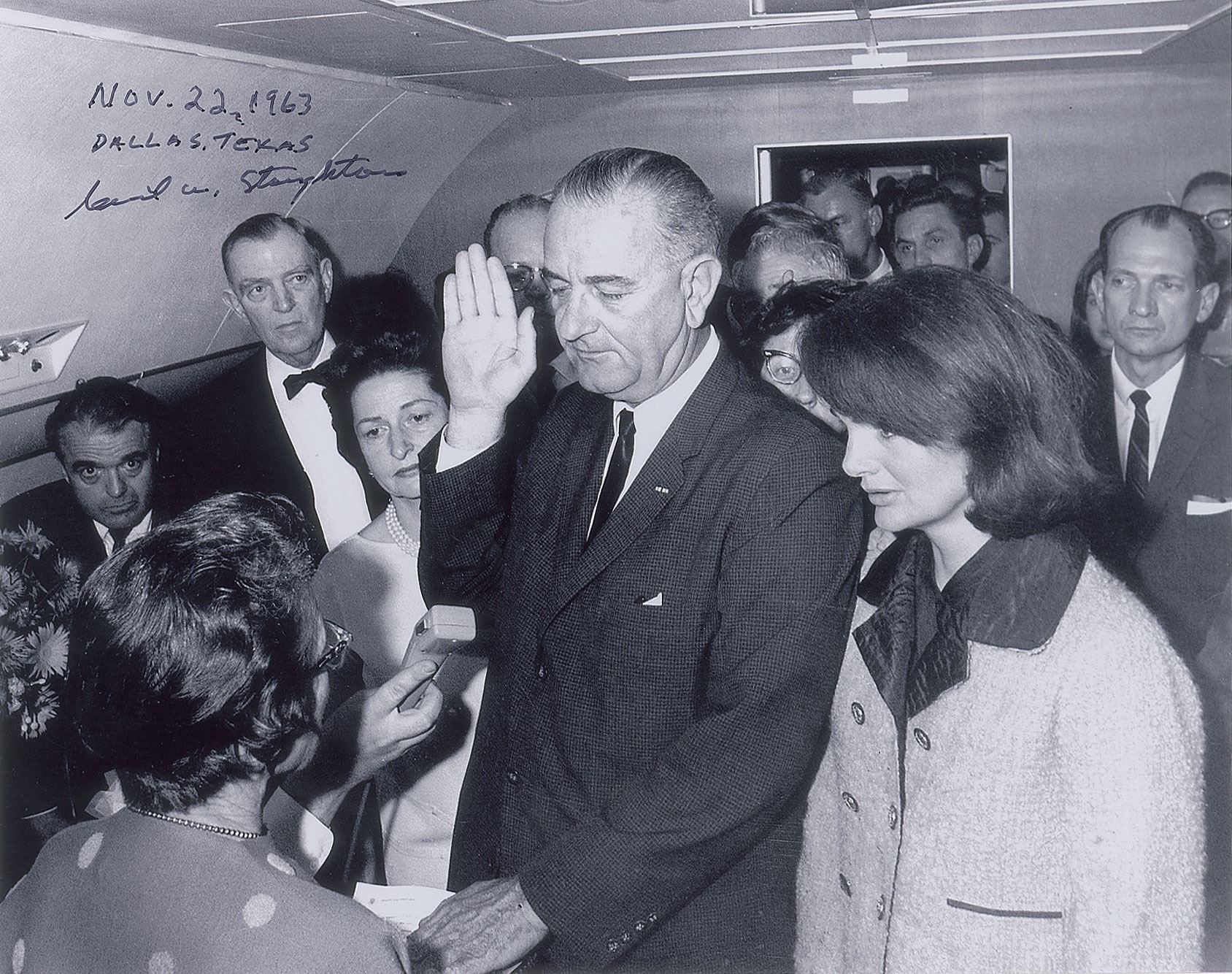Glossy 10 x 8 photo of Lyndon B. Johnson being sworn in as president on Air Force One following the assassination of John F. Kennedy, signed in black ink by the official White House photographer who captured the historic moment: “Nov. 22, 1963, Dallas, Texas, Cecil W. Stoughton.” Other notable figures in the image are Judge Sarah T. Hughes, administering the oath in the lower left; the new first lady, Lady Bird Johnson; and the mourning former first lady, Jacqueline Kennedy, still dressed in her blood-stained pink Chanel suit. In very fine condition.