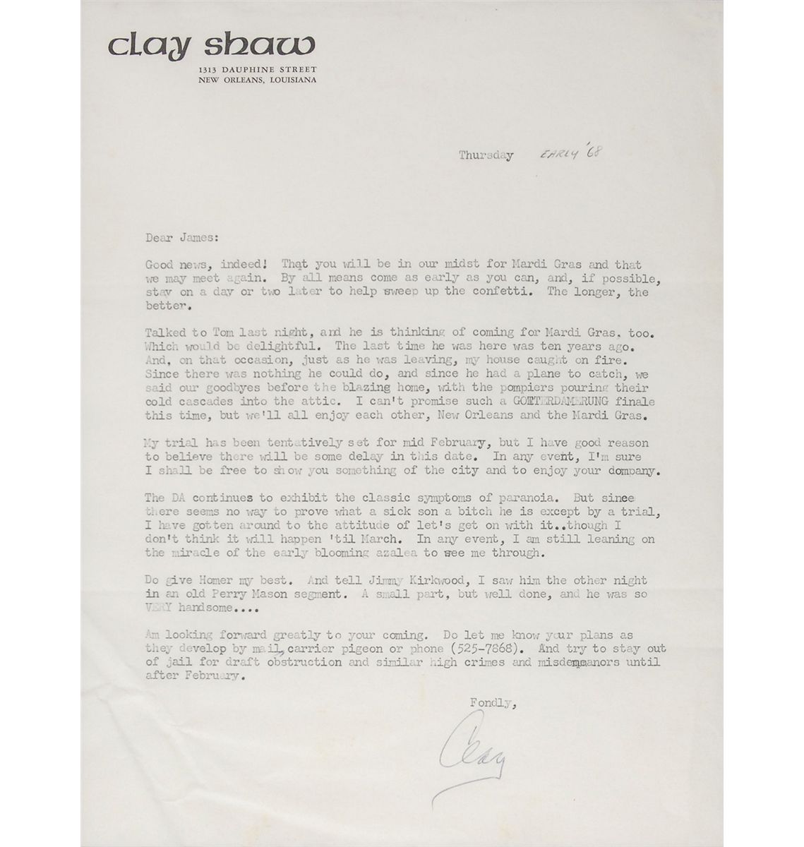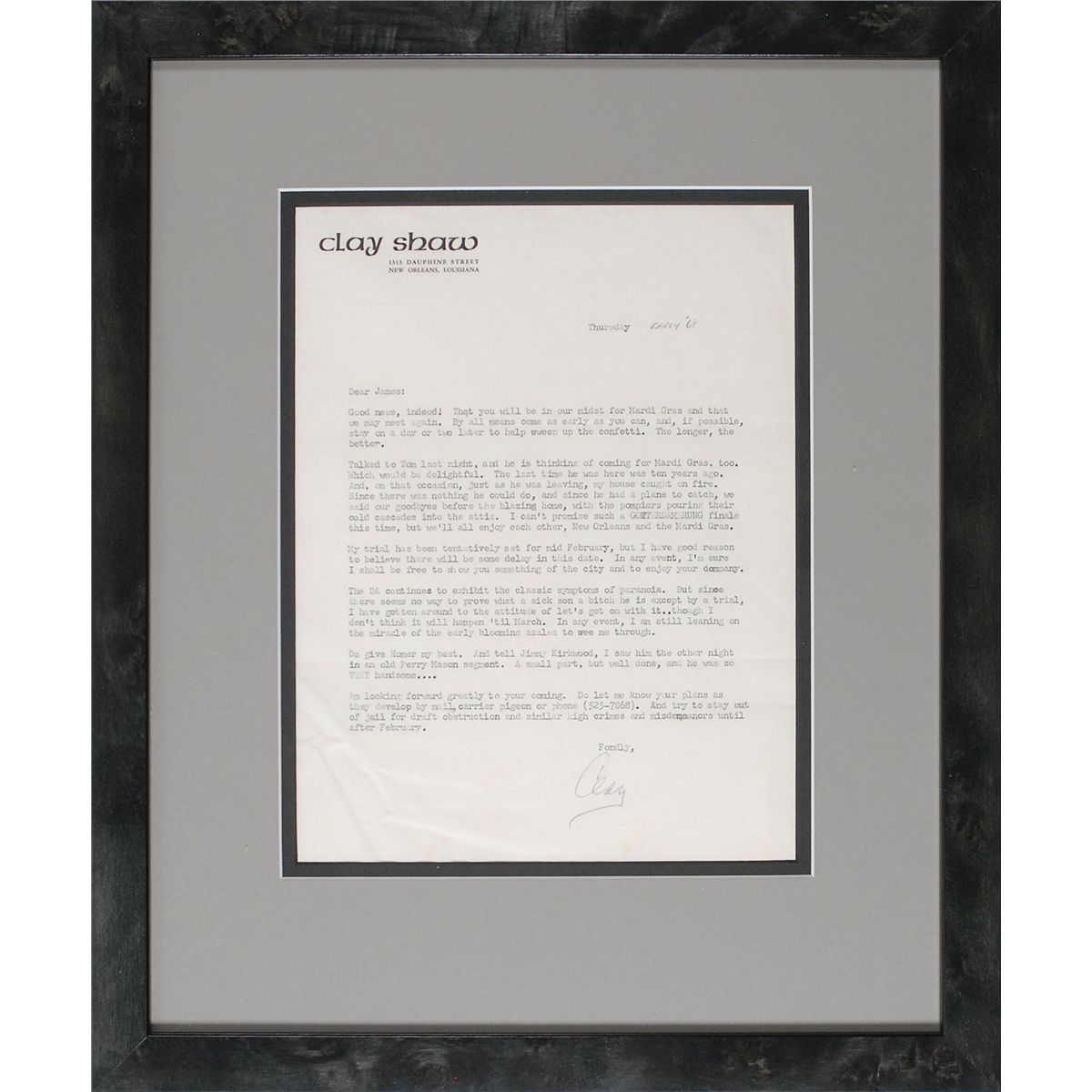 Businessman (1913–1974) who was the only person prosecuted in connection with the assassination of President John F. Kennedy; he was ultimately found not guilty. TLS signed “Clay,” one page, 8 x 10.25, personal letterhead, circa early 1968. Letter to a friend. In part: “My trial has been tentatively set for mid February, but I have good reason to believe there will be some delay in this date. In any event, I’m sure I shall be free to show you something of the city…The DA continues to exhibit the classic symptoms of paranoia. But since there seems no way to prove what a sick son a bitch he is except by a trial, I have gotten around to the attitude of let’s get get on with it…though I don’t think it will happen ’til March. In any event, I am still leaning on the miracle of the early blooming azalea to see me through…Do let me know your plans as they develop by mail, carrier pigeon of phone…And try to stay out of jail for draft obstruction and similar high crimes and misdemeanors until after February.” Double-matted and framed to an overall size of 14.5 x 17.5. Noticeable creasing to the lower left, otherwise fine condition. A letter with excellent content as Shaw offers his opinion on his courtroom nemesis.