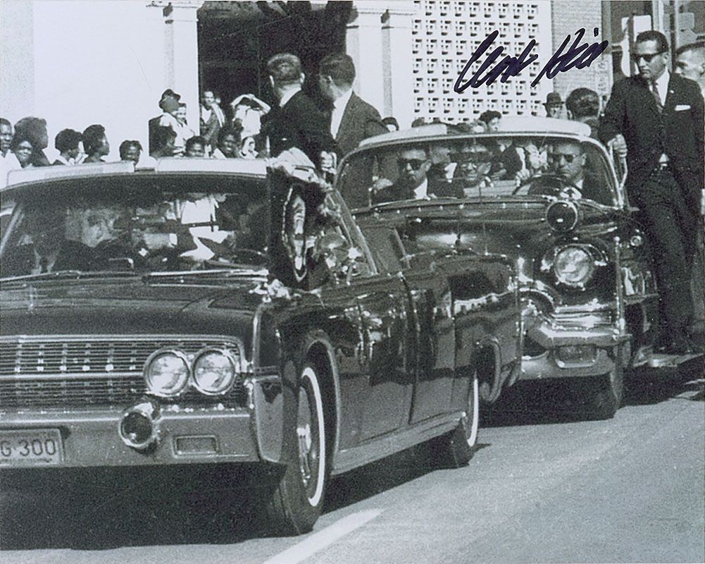 Secret Service Agent #9 assigned to the president’s motorcade detail on November 22, 1963. After hearing the fateful shot, Hill leapt onto Kennedy’s limousine and accompanied the fallen President and First Lady as they raced to Parkland Memorial Hospital. Satin-finish 10 x 8 photo of Hill riding along the side of the car following President Kennedy’s, signed in black felt tip. In fine condition, with a bit of a grainy appearance.