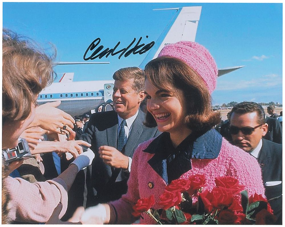 Secret Service Agent #9 assigned to the president’s motorcade detail on November 22, 1963. After hearing the fateful shot, Hill leapt onto Kennedy’s limousine and accompanied the fallen President and First Lady as they raced to Parkland Memorial Hospital. Color satin-finish 10 x 8 photo of Hill behind the Kennedys after landing in Dallas, signed in black felt tip. In very fine condition. Accompanied by two photos taken at the time of signing.