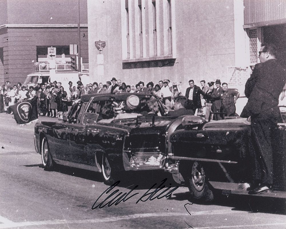 Satin-finish 8 x 10 photo of Agent Hill riding along the side of the car following President Kennedy moments before his assassination, signed in black felt tip. In fine condition.