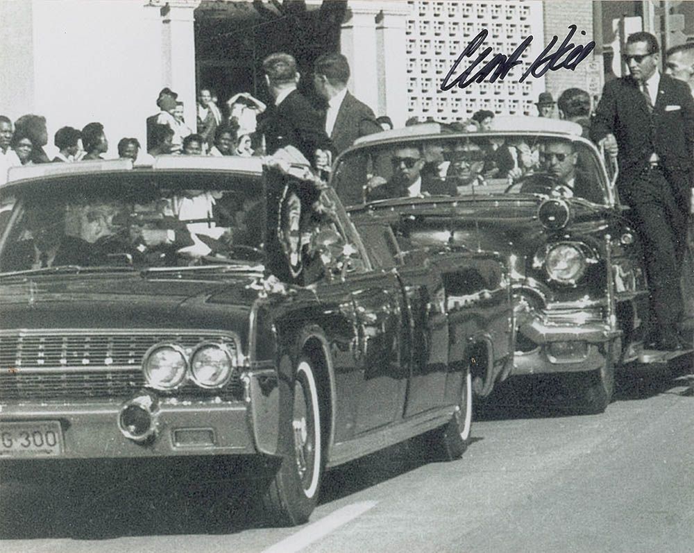 Satin-finish 10 x 8 photo of Agent Hill riding along the side of the car following President Kennedy moments before his assassination, signed in black felt tip. In fine condition.