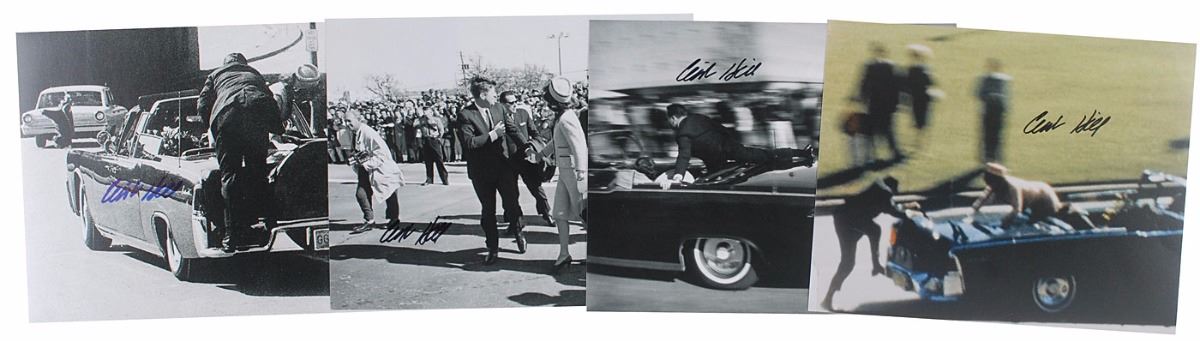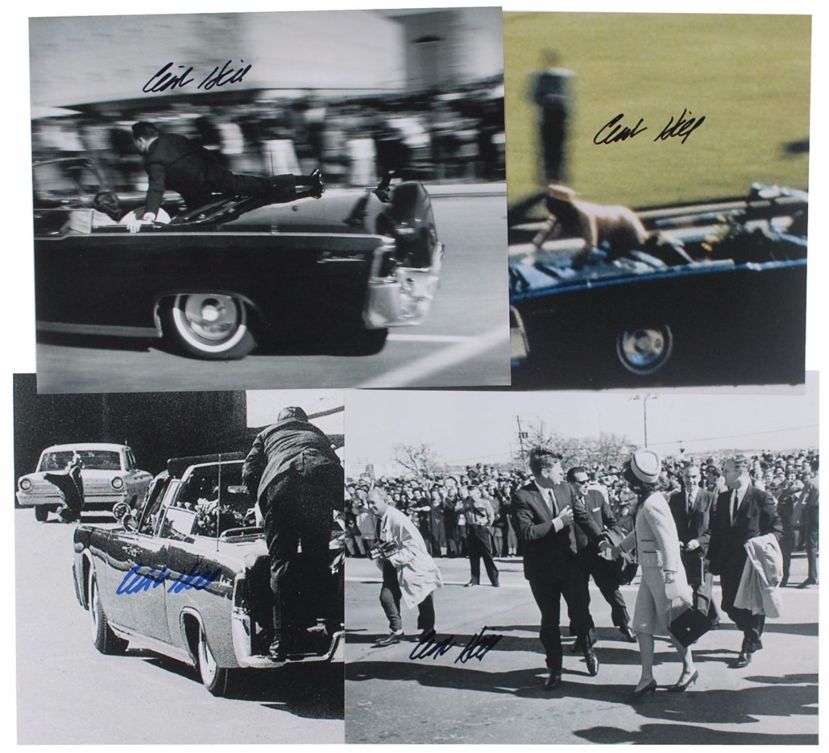 Set of four satin-finish photos from the day President Kennedy was assassinated, 10 x 8 and 12 x 8, each signed by former United States Secret Service agent Clint Hill in black or blue felt tip. In overall fine condition, with an expected slightly grainy quality to the images. Accompanied by several photos taken at the time of signing.