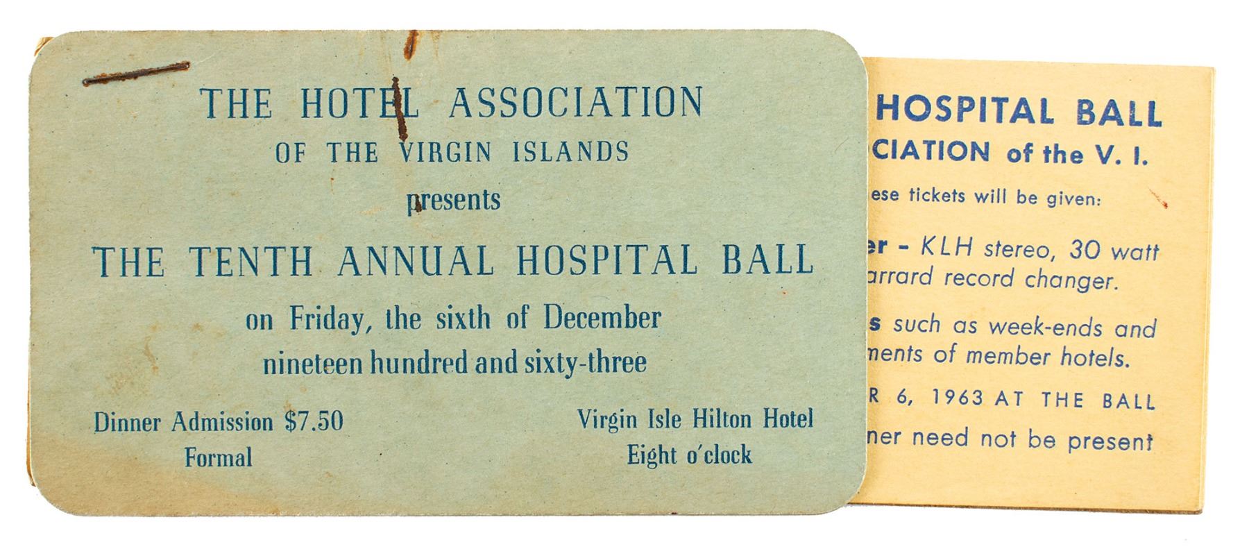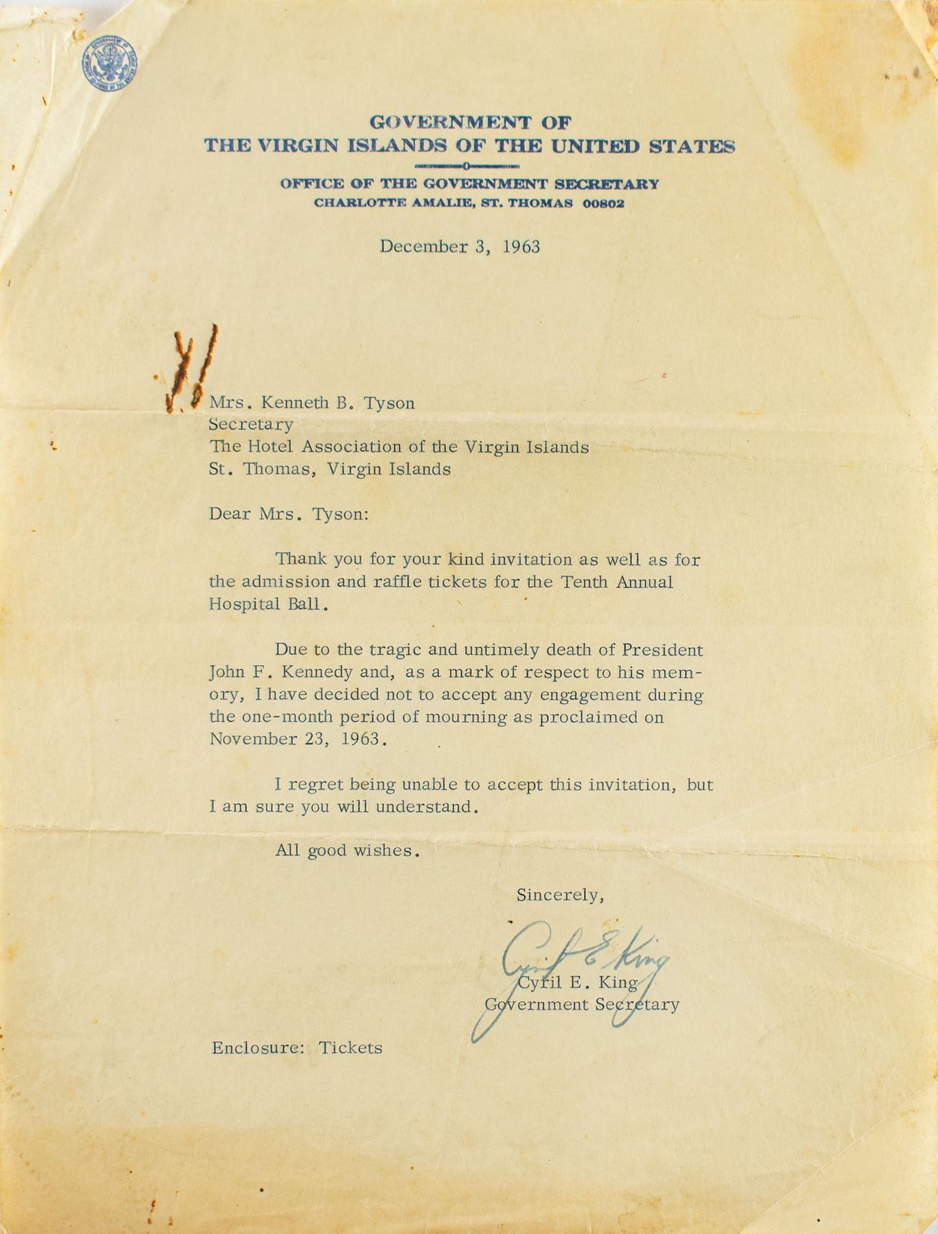 TLS signed “Cyril E. King,” one page, 8 x 10.5, Government of the Virgin Islands of the United States letterhead, December 3, 1963. Letter declining an invitation due to the assassination of President Kennedy, in part: "Thank you for your kind invitation as well as for the admission and raffle tickets for the Tenth Annual Hospital Ball. Due to the tragic and untimely death of President John F. Kennedy and, as a mark of respect to his memory, I have decided not to accept any engagement during the one-month period of mourning as proclaimed on November 23, 1963." The stapled packet of raffle tickets with admission pass is included. In very good to fine condition, with creasing, staining, and an edge tear to the letter; the tickets themselves are fine.