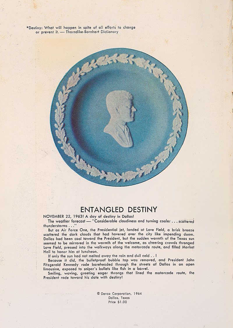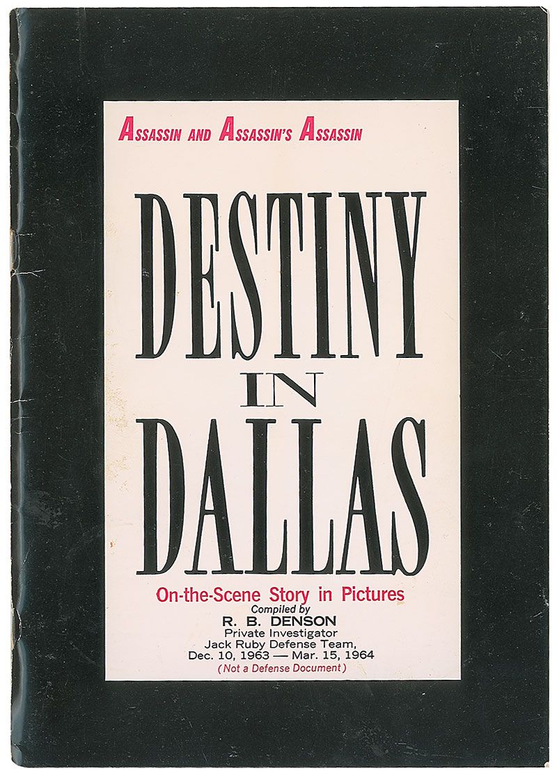 Destiny in Dallas unsigned book compiled by private investigator R. B. Denson, which Ruby prosecutor Jim Bowie sent to his mother. Dallas: Denco, 1964. Softcover, 7 x 10, 64 pages. In fine condition, with some slight soiling. Accompanied by the original mailing envelope.