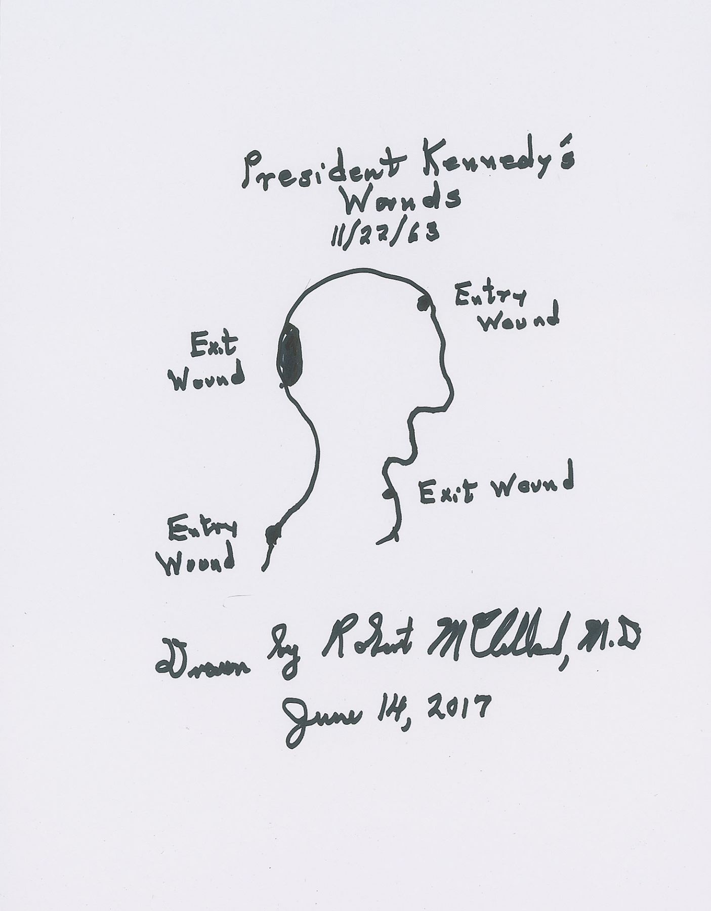 Original signed felt tip sketch of "President Kennedy's Wounds" on a white 8.5 x 11 cardstock sheet, signed "Drawn by Robert McClelland, M.D., June 14, 2017." The sketch shows President Kennedy's head in profile, with the entry and exit wounds labeled on the head and neck. In fine condition. McClelland has always maintained that the mortal wound—the head wound—came from the front, likely fired from the 'Grassy Knoll' ahead of Kennedy's motorcade; he maintains that there were at least two shooters and that the assassination was likely a conspiracy involving government elements.