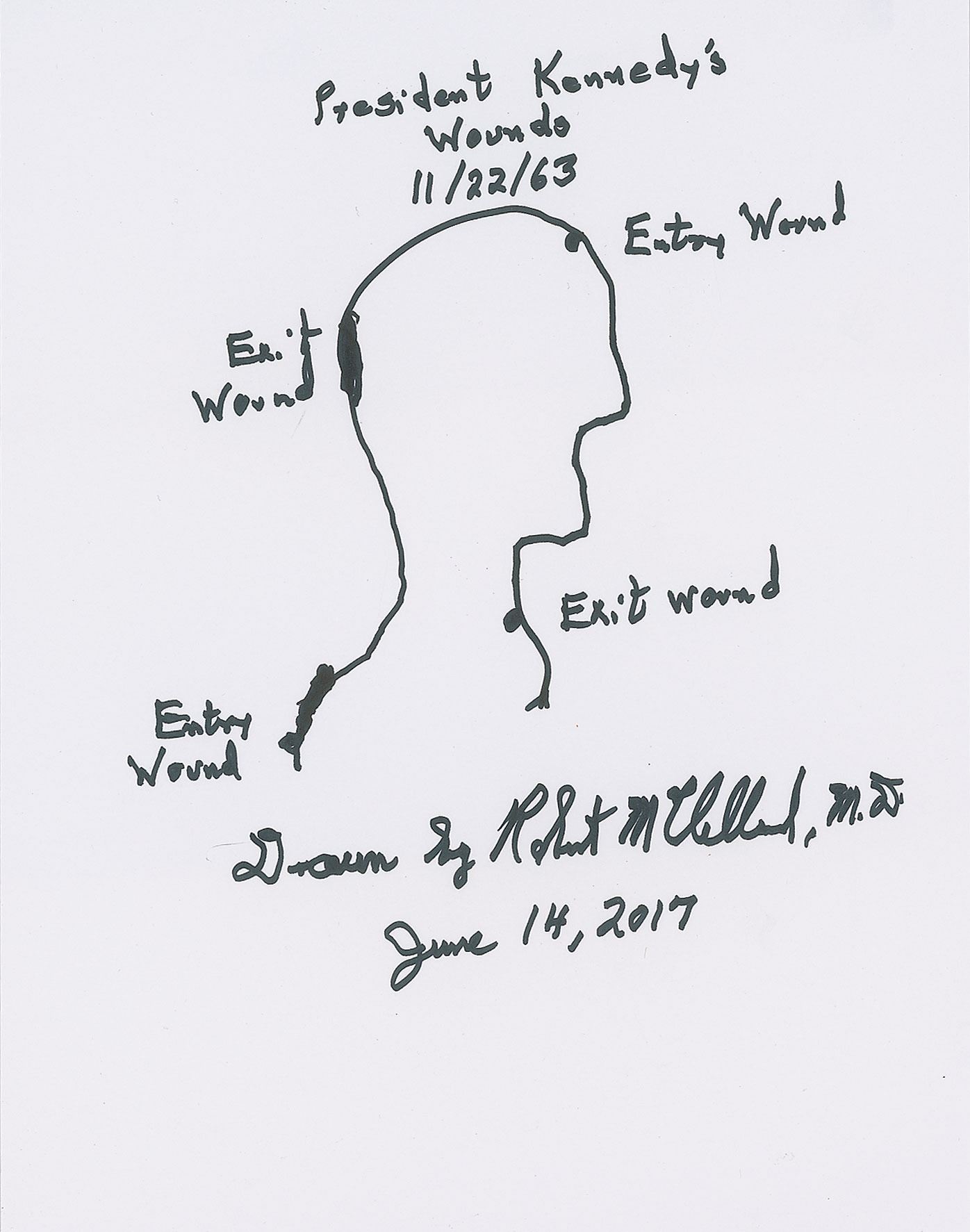 Original signed felt tip sketch of "President Kennedy's Wounds" on a white 8.5 x 11 cardstock sheet, signed "Drawn by Robert McClelland, M.D., June 14, 2017." The sketch shows President Kennedy's head in profile, with the entry and exit wounds labeled on the head and neck. In fine condition. This version of McClelland's sketch has two wounds to the front: an entry point at the hair line and an exit wound to lower neck. The upper back features an entry wound, and the back of the head shows a large exit wound. McClelland has always maintained that the mortal wound—the head wound—came from the front, likely fired from the 'Grassy Knoll' ahead of Kennedy's motorcade; he maintains that there were at least two shooters and that the assassination was likely a conspiracy involving government elements.