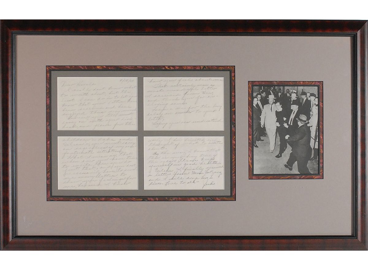 ALS in pencil, signed “Jack,” four pages, 5.75 x 3.75, April 15, 1964. Letter to his brother-in-law, Harold Kaminsky. In part: “You still must carry on with your livelihood, and please for the children’s sake and Eileen’s, you must carry on regardless of my unfortunate situation. What I mean is, that when you have time to write, then you do just that; and you don’t necessarily have to send me many letters to show your feelings for me, because I know how you feel about me.” Attractively triple-matted and framed with an image of Ruby shooting Oswald to an overall size of 27.5 x 17.5. In overall fine condition. A desirable letter written as Ruby contemplates the fate of himself and his family—just one month prior, on March 14, 1964, Ruby had been found guilty of the murder of Lee Harvey Oswald and sentenced to death; this decision was overturned two years later in appellate court, but Ruby died of a pulmonary embolism in 1967 while awaiting a retrial. Oversized.