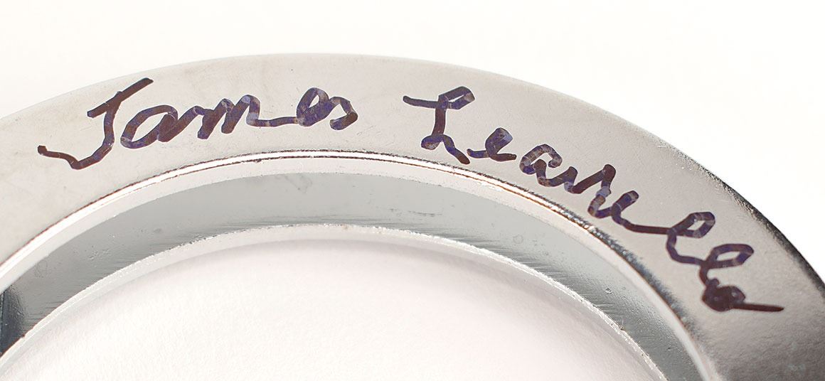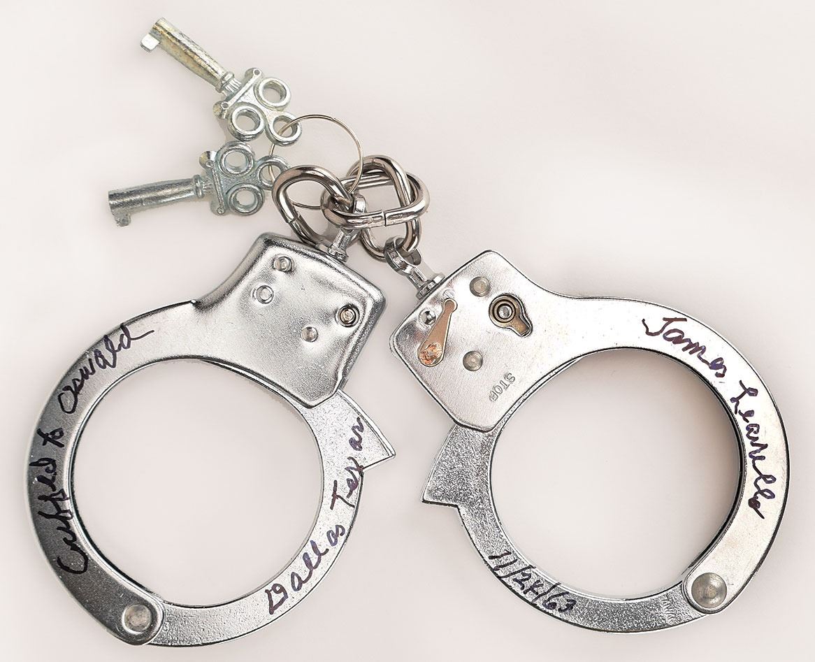 Dallas Police Department homicide detective (1920–2019) who escorted John F. Kennedy assassin Lee Harvey Oswald through the basement of Dallas Police headquarters when Oswald was shot by Jack Ruby on November 24, 1963. Pair of metal handcuffs with a polished finish, signed on one cuff in black felt tip, "James Leavelle, 11/24/63," and on the other, "Cuffed to Oswald, Dallas, Texas." In very fine condition. The keys are included.
