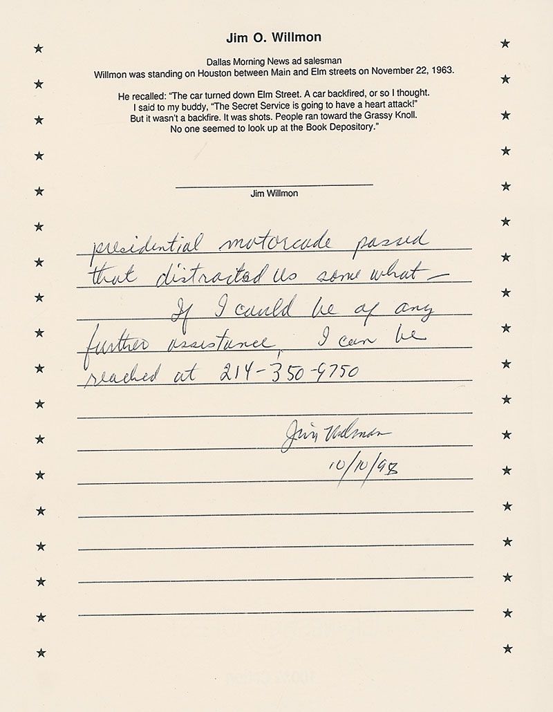 Handwritten firsthand account of Willmon’s experience as a witness to the assassination, two pages, 8.5 x 11, signed at the conclusion in black ballpoint, “Jim Willmon, 10/10/98.” In part: “Time has taken its toll on the exact memory of what went on that day. I remember very well that there was enough time between the first shot and the others that I had time to make the remark about the Secret Service.” In fine condition. Thinking that the first shot was actually a car backfiring, Willmon had joked, ‘The Secret Service is going to have a heart attack!’