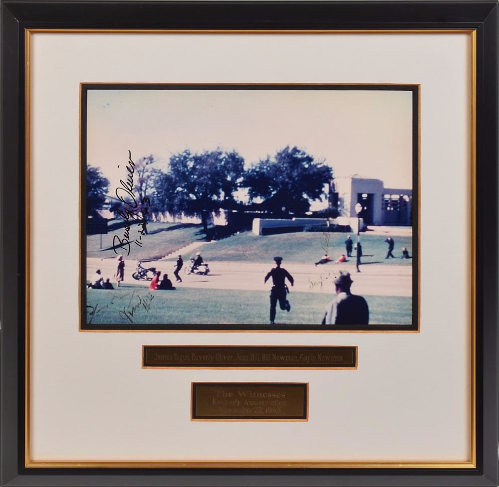 Color glossy 10.5 x 7.5 photo of Dealey Plaza in the moments after the assassination, signed in black felt tip by witnesses James Tague, Beverly Oliver, Jean Hill, Bill Newman, and Gayle Newman. Double-matted and framed with two plaques to an overall size of 16 x 16. In fine condition, with substantial fading to all of the signatures except Oliver's.