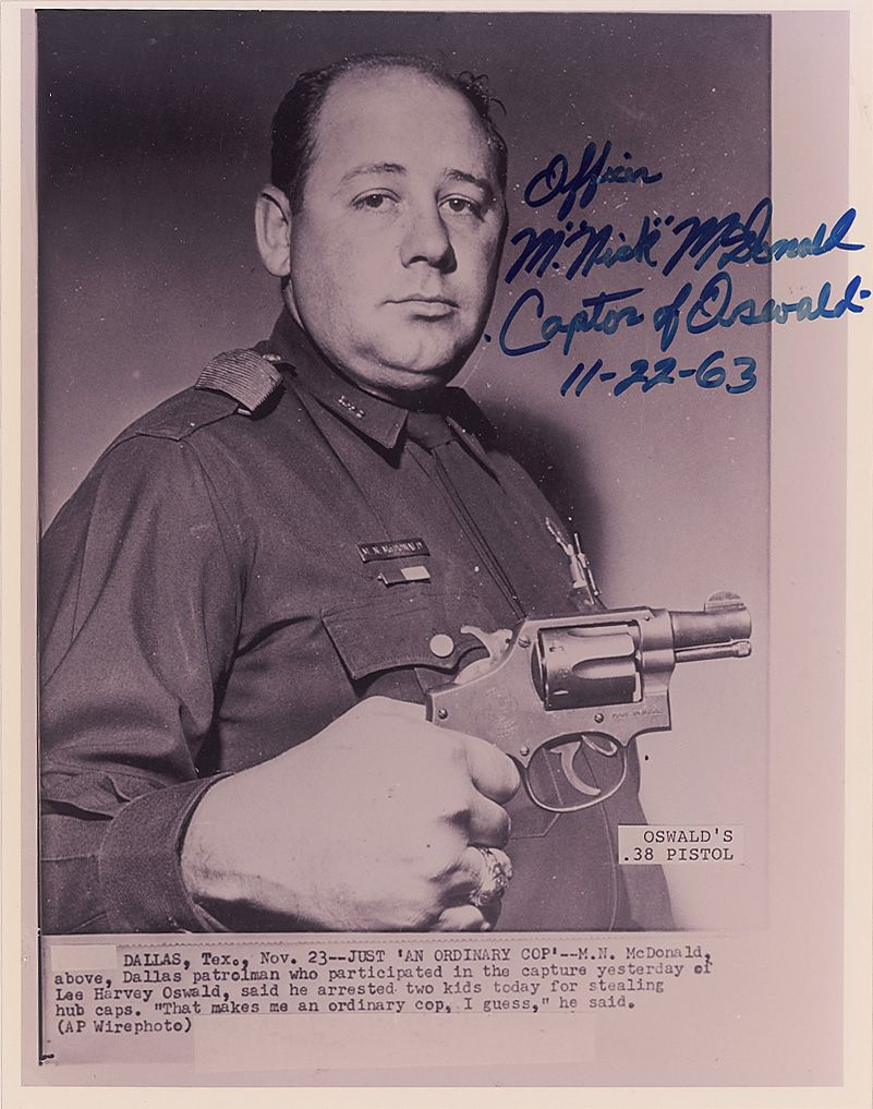 Dallas patrolman who captured Lee Harvey Oswald after the assassination of JFK on November 22, 1963. Glossy 8 x 10 photo of McDonald holding Lee Harvey Oswald’s pistol, recently signed in blue felt tip, “Officer M. ‘Nick’ McDonald, Captor of Oswald, 11-22-63,” referring to the date of the capture. In fine condition.