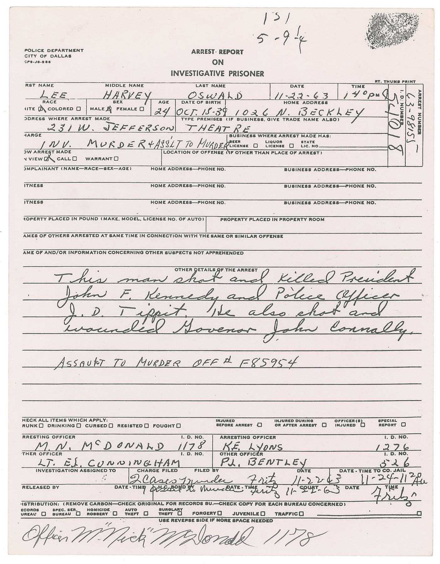 Souvenir document reproducing Lee Harvey Oswald's arrest report and fingerprint card, two cardstock pages, 8.5 x 11, each signed along the bottom in black ballpoint by the arresting officer, "Officer M. 'Nick' McDonald 1178." The document notes: "This man shot and killed President John F. Kennedy and Police Officer J. D. Tippit. He also shot and wounded Governor John Connally." In fine condition.
