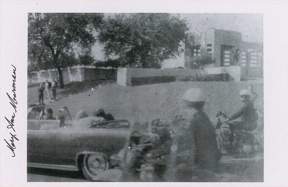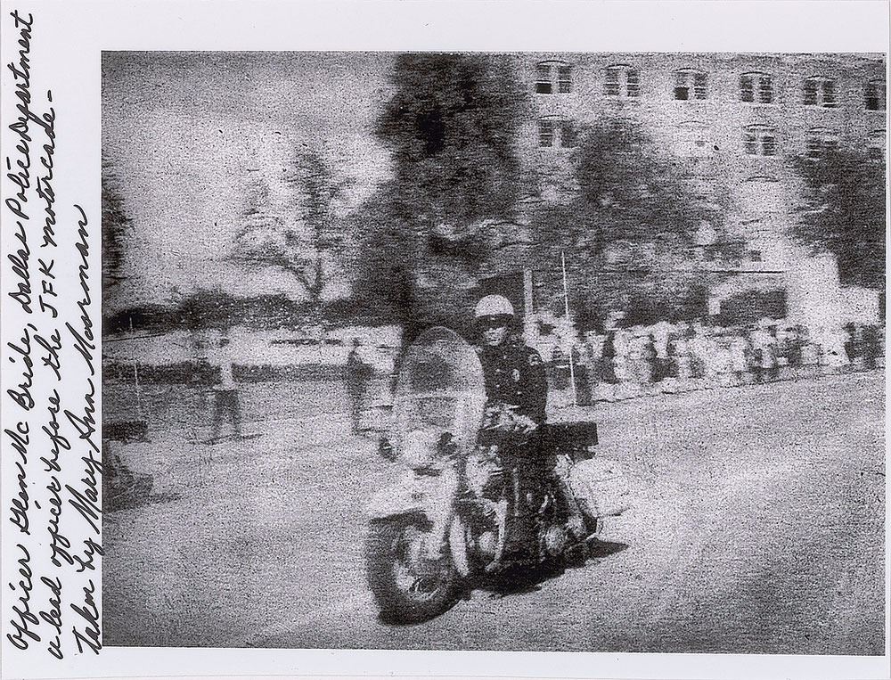 Eyewitness to the Kennedy assassination (born 1932) known for her photograph capturing the presidential limousine a fraction of a second after the fatal shot. Two photos signed by Moorman: a cardstock 5.75 x 4.25 photo of Dallas policeman Glen McBride on a motorcycle, captioned and signed in the margin in black ink, "Officer Glen McBride, Dallas Police Department a lead officer before the JFK motorcade—taken by Mary Ann Moorman"; and a cardstock 8.5 x 5.5 photo of the presidential limousine taken by Moorman a moment after the fatal shot, signed in the left margin in black ink, "Mary Ann Moorman." In overall fine condition.