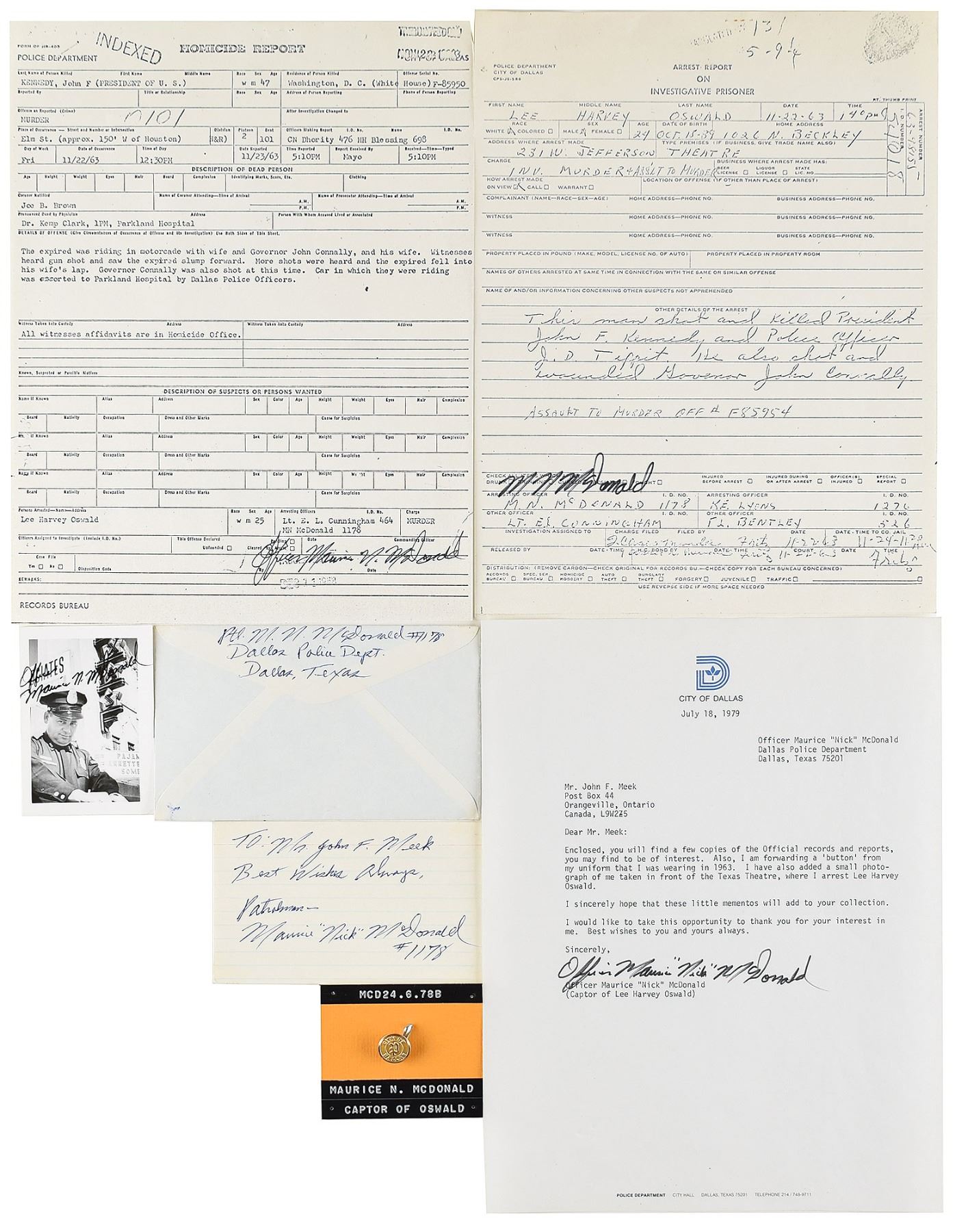 As referenced in the letter, the group lot includes: a copy of the Dallas Police Department (DPD) arrest report for Lee Harvey Oswald, signed below in black felt tip, “M. N. McDonald,” with arrest details: “This man shot and killed President John F. Kennedy and Police Officer J. D. Tippit. He also shot and wounded Governor John Connally”; a copy of the DPD homicide report for the murder of John F. Kennedy, signed below in black ink, “Officer Maurice N. McDonald”; a matte-finish 2.5 x 3.5 photo of McDonald at Texas Theatre, signed in black ink, “Officer Maurice N. McDonald”; and a gold-tone “City of Dallas” police uniform button belonging to McDonald. Also included: a ballpoint signature and inscription, “To: Mr. John F. Meek, Best wishes always, Patrolman—Maurice ‘Nick’ McDonald, #1178,” on an off-white 5 x 3 card; a ballpoint signature, “Ptl. M. N. McDonald #1178, Dallas Police Dept., Dallas, Texas,” penned on the reverse of a 6 x 3.5 mailing envelope; a copy of a 4-page handwritten account of McDonald’s “Arrest and Capture of Lee Harvey Oswald,” inscribed by McDonald on the last page in black felt tip, “for John F. Meek”; copies of the finger and hand-prints of Oswald and Jack Ruby, and a copy of the homicide report for Oswald. In overall fine condition.