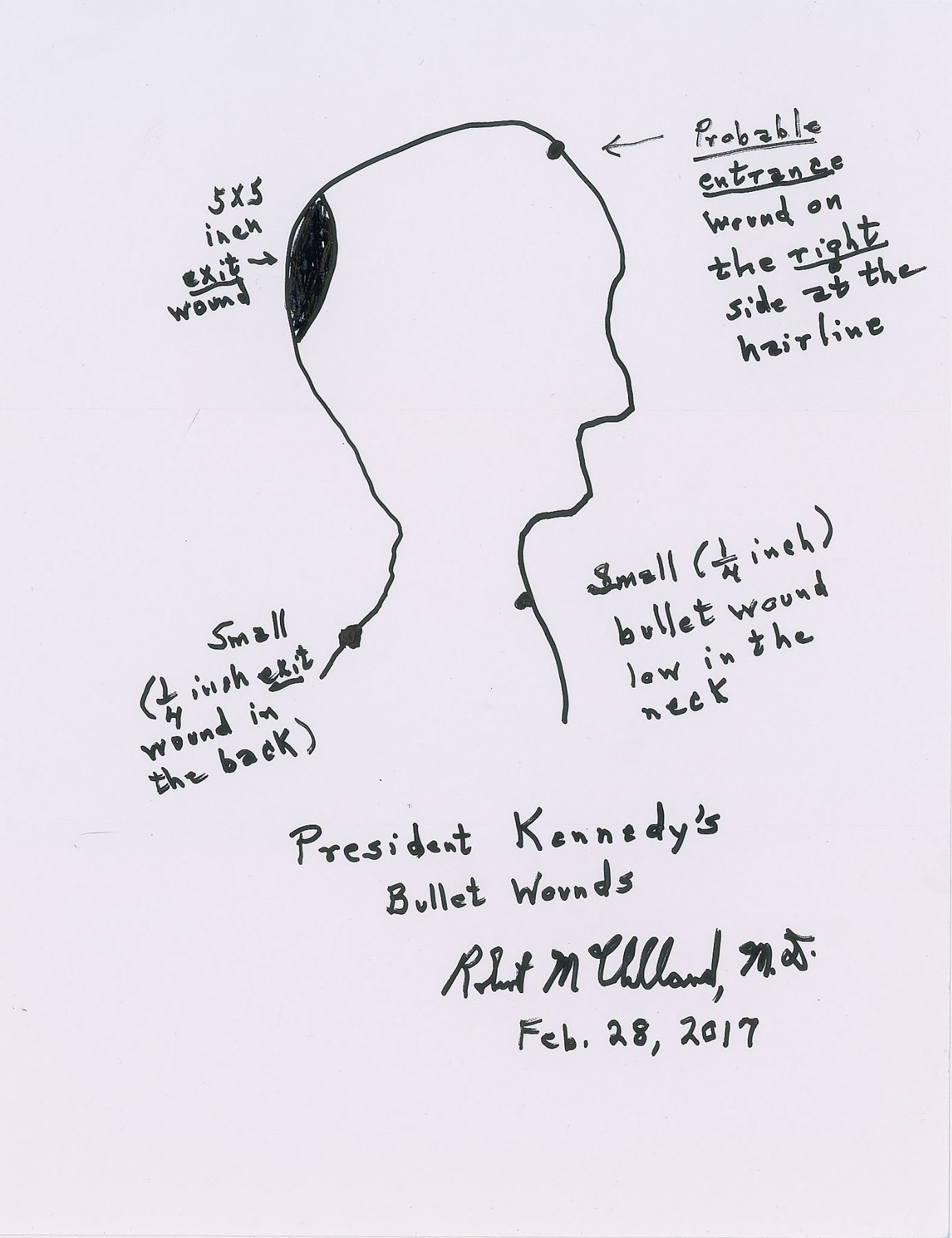 Surgeon at Parkland Hospital who attended to President Kennedy after he was shot on November 22, 1963. Original signed felt tip sketch of "President Kennedy's Bullet Wounds" on a white 8.5 x 11 cardstock sheet, signed "Robert McClelland, M.D., Feb. 28, 2017." The sketch shows President Kennedy's head in profile, with the entry and exit wounds labeled on the head and neck. In fine condition. This version of McClelland's sketch has two wounds to the front: a "probable" entry point at the hair line, and then another wound to lower neck. The back features another "small" wound, and the back of the head shows the "5 x 5 inch exit wound." McClelland has always maintained that the mortal wound—the head wound—came from the front, likely fired from the 'Grassy Knoll' ahead of Kennedy's motorcade; he maintains that there were at least two shooters and that the assassination was likely a conspiracy involving government elements.