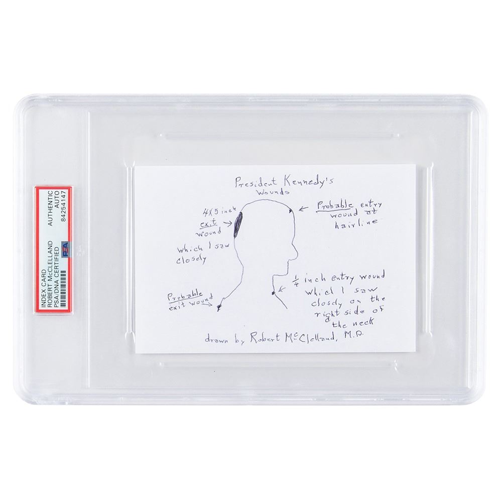 Surgeon (1929-2019) at Parkland Hospital who attended to President Kennedy after he was shot on November 22, 1963. Original ballpoint sketch of "President Kennedy& #39;s Wounds" accomplished by Dr. McClelland on a white 6 x 4 card, signed along the bottom, "drawn by Robert McClelland, M.D." He annotates the diagram to identify the "Probably entry wound at hairline," "4x5 inch exit wound which I saw closely," "1/4 inch entry wound which I saw closely on the right side of the neck," and "Probable exit wound." In very fine condition. In McClelland& #39;s opinion, President Kennedy was first shot from behind with the bullet exiting the front of his neck low on the right side, and several seconds later he was shot in the head from the front (this bullet killed him). Encapsulated in a PSA/DNA authentication holder.