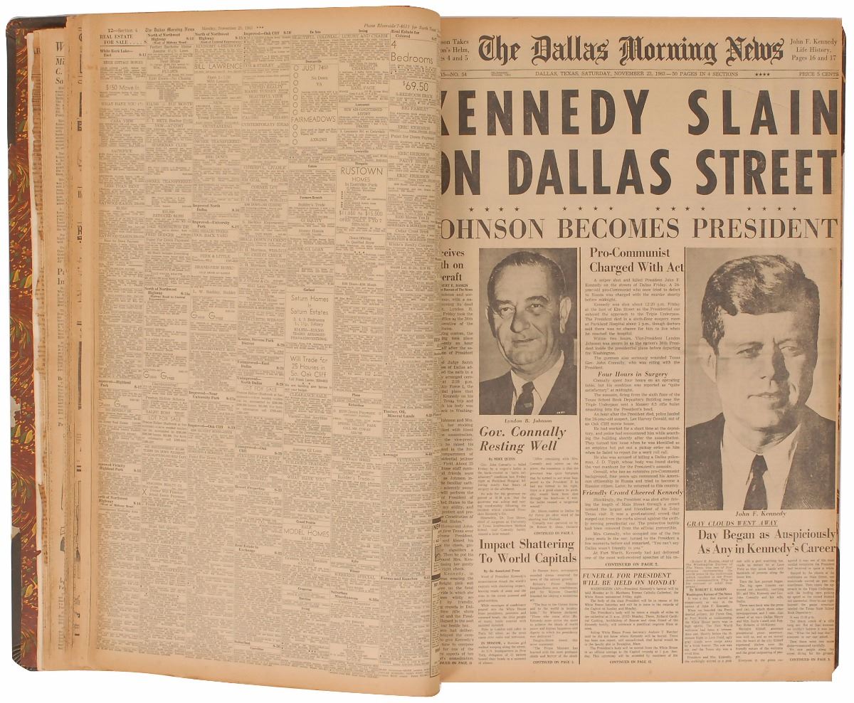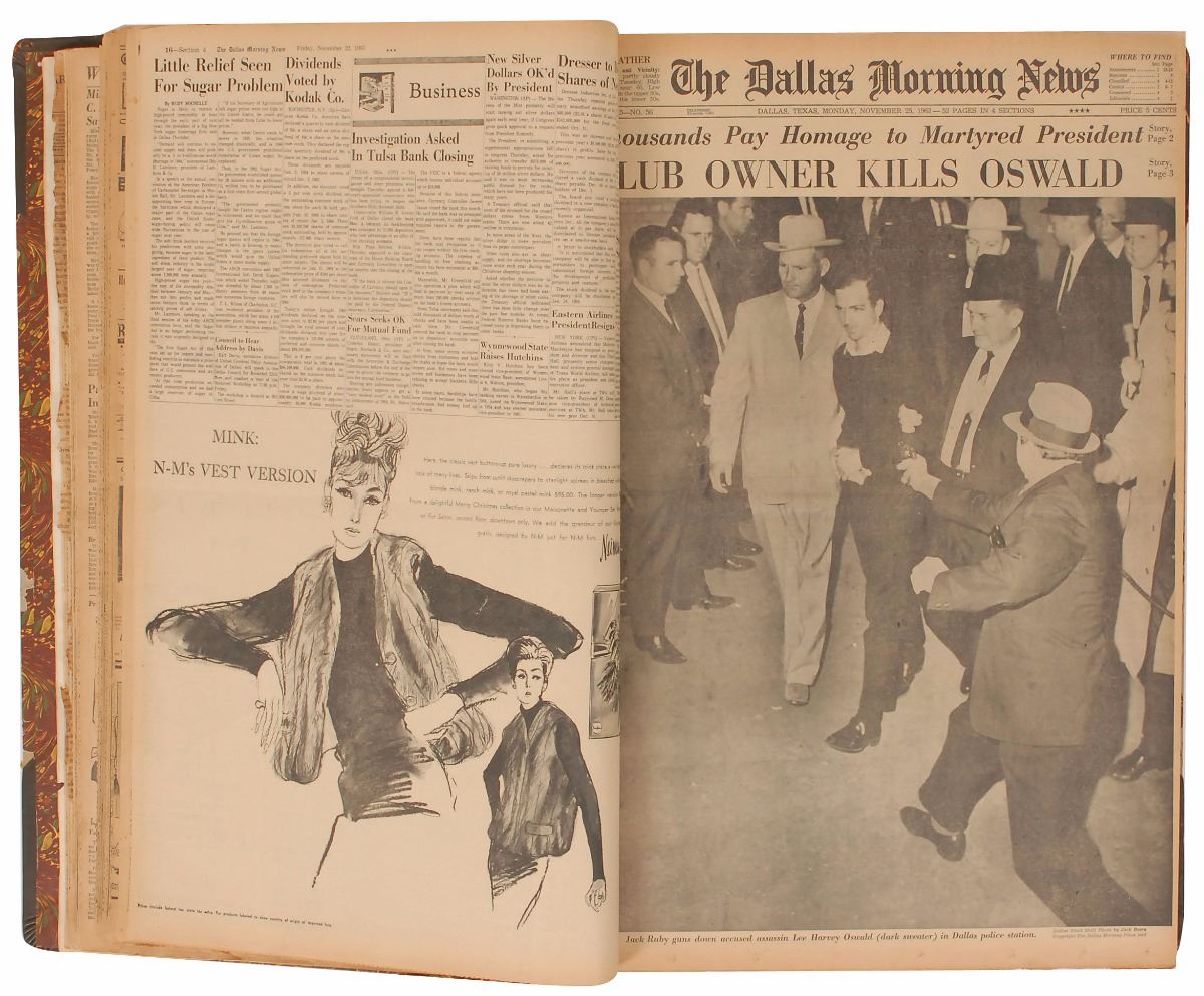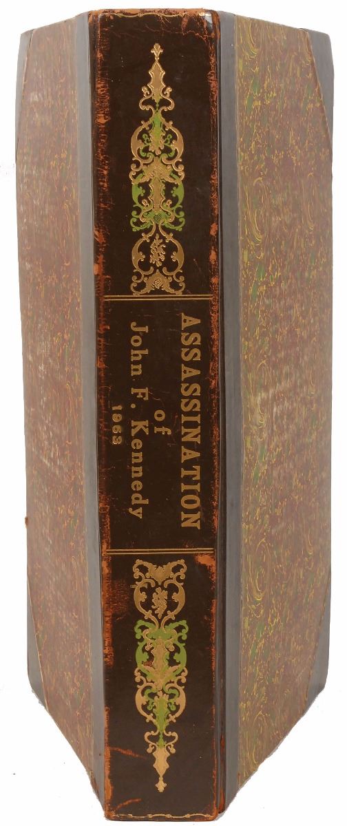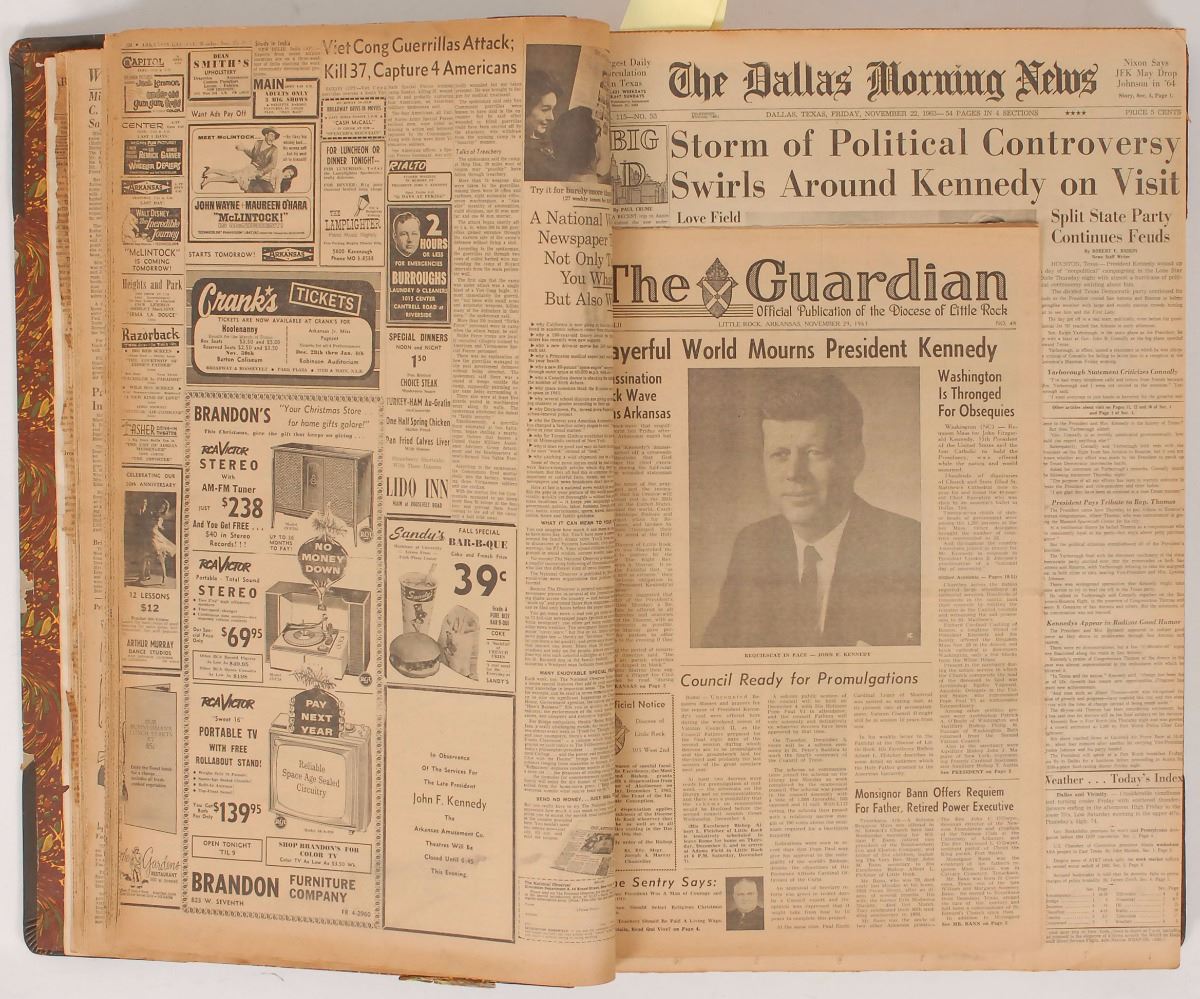 Enormous custom-made leatherbound compilation of newspapers providing coverage of JFK’s assassination, measuring 15.5 x 23 x 3.5, featuring various newspapers dating from October 2, 1963, through March 15, 1964, with the majority from the immediate aftermath of the assassination. Includes issues of the Dallas Morning News from November 22nd (prior to assassination), 23rd (announcing assassination), and 25th (showing Ruby shooting Oswald). Many of the other newspapers from Arkansas. In very good condition, with toning and chipping to various pages. Oversized.