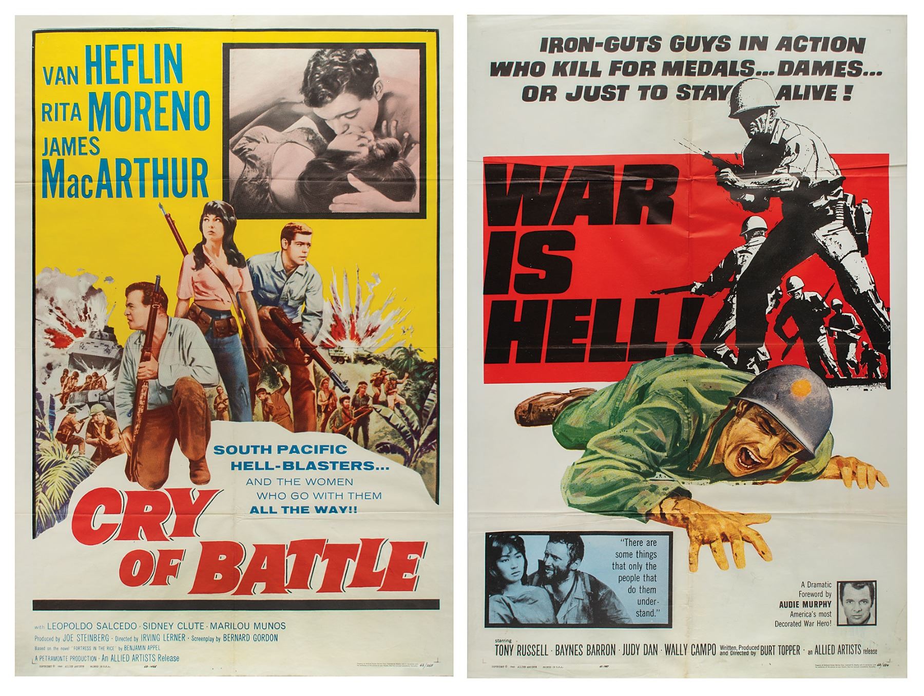 Three items: an original vintage glossy 8 x 10 press photo of the Dallas theater where Lee Harvey Oswald was captured, taken on November 22, 1963, showing the films Cry of Battle and War Is Hell on the marquee; and original 27 x 41 one sheet posters for both movies, folded as issued. In fine condition.