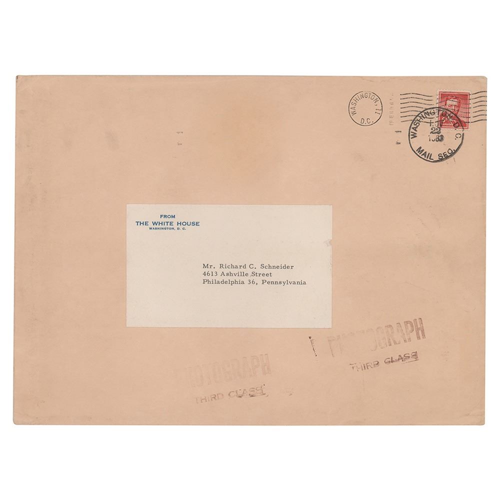 Uncommon photograph mailing envelope from the White House, 11.5 x 8.5, postmarked on November 22, 1963, the date of the assassination of President John F. Kennedy. The envelope bears an affixed White House label addressed to "Mr. Richard C. Schneider, 4613 Ashville Street, Philadelphia 36, Pennsylvania." In fine condition, with some light soiling.