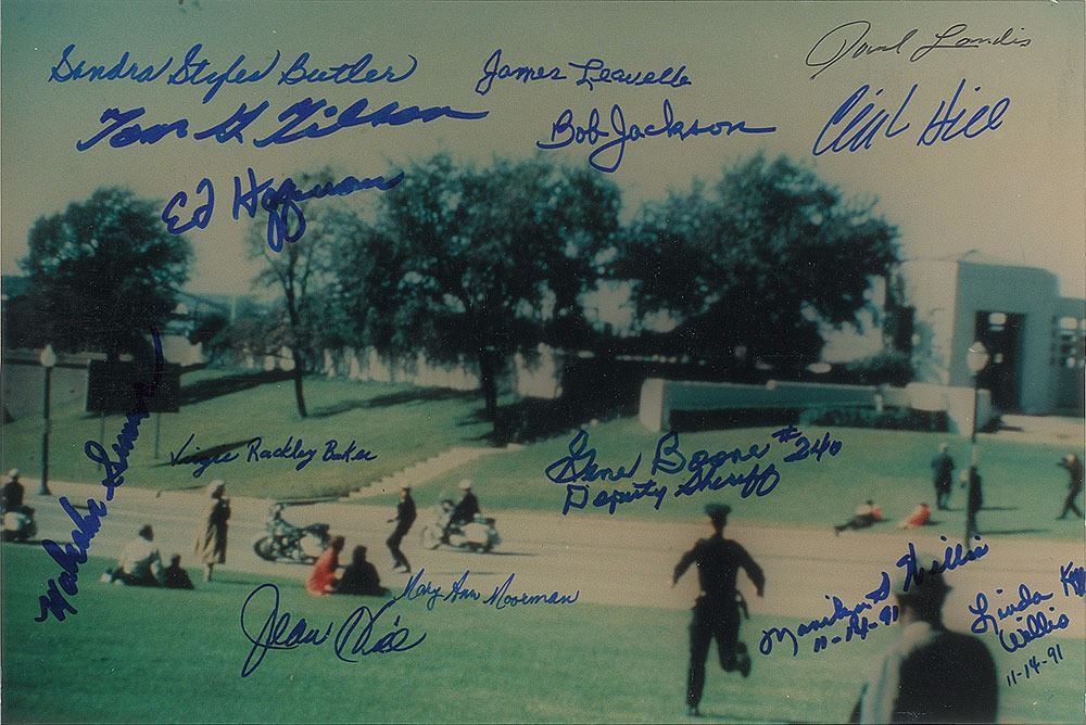 Color glossy 12 x 8 photo of Dealey Plaza in the aftermath of the Kennedy assassination, signed in blue or black felt tip by 14 witnesses: Marilyn Willis, Linda Willis, Jean Hill, Ed Hoffman, Tom Tilson, Malcolm Summers, Clint Hill, Paul Landis, Virgie Baker, Gene Boone, Mary Ann Moorman, James Leavelle, Bob Jackson, and Sandra Styles Butler. In fine condition, with light creasing to two corners.