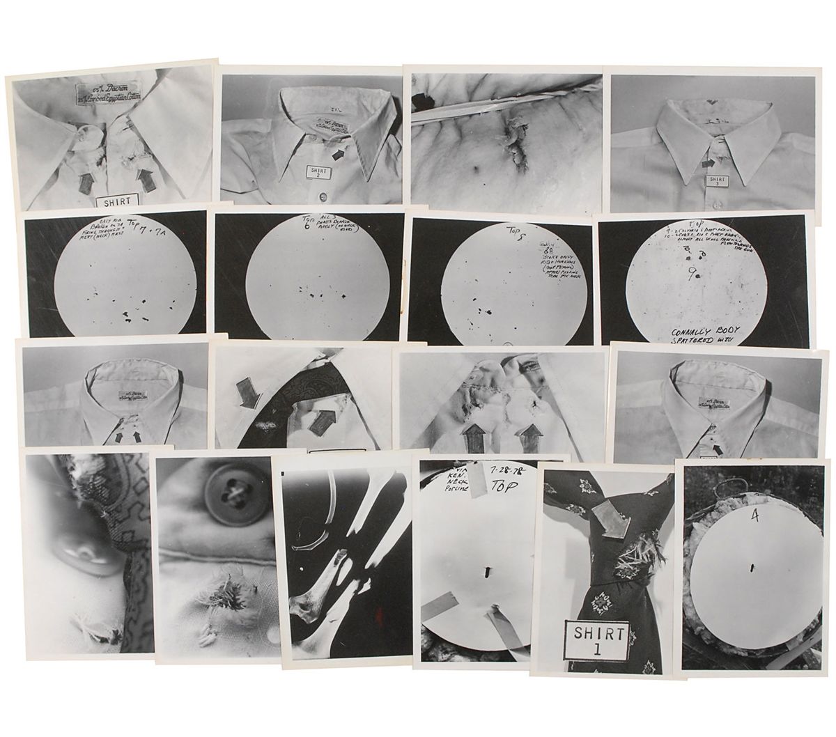 Collection of 18 original first generation glossy photos, all 7 x 5 and 5 x 7, of test results of experiments done by Dr. John K. Lattimer for his book Kennedy and Lincoln: Medical and Ballistic Comparisons of Their Assassinations. Photos show the results of test wounds fired through clothing, spatter results, an X-ray, and targets, all used by Lattimer to prove Oswald killed Kennedy. In fine condition. Lattimer fired countless rounds of similar ammunition through skulls with simulated brains as well as necks and bodies constructed of pork to simulate human skin. Highly important photos attempting to finally close the case if Oswald acted alone.