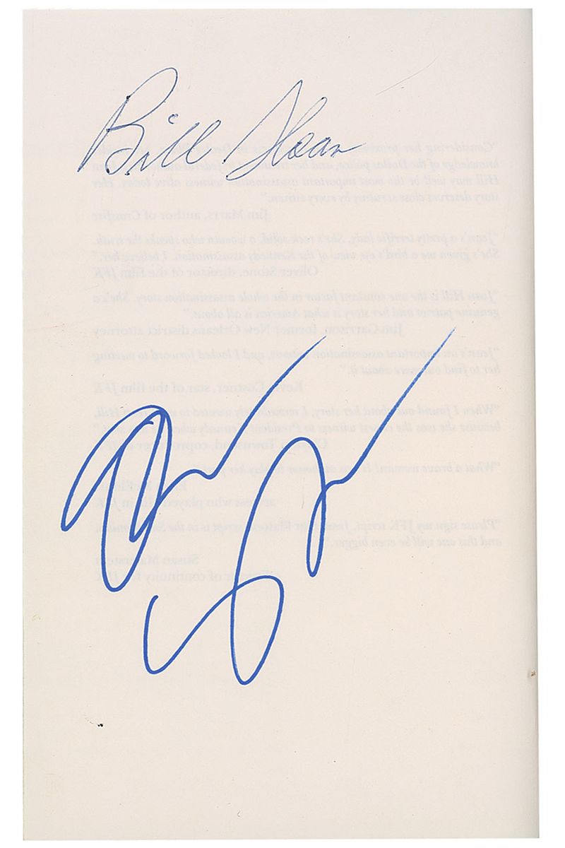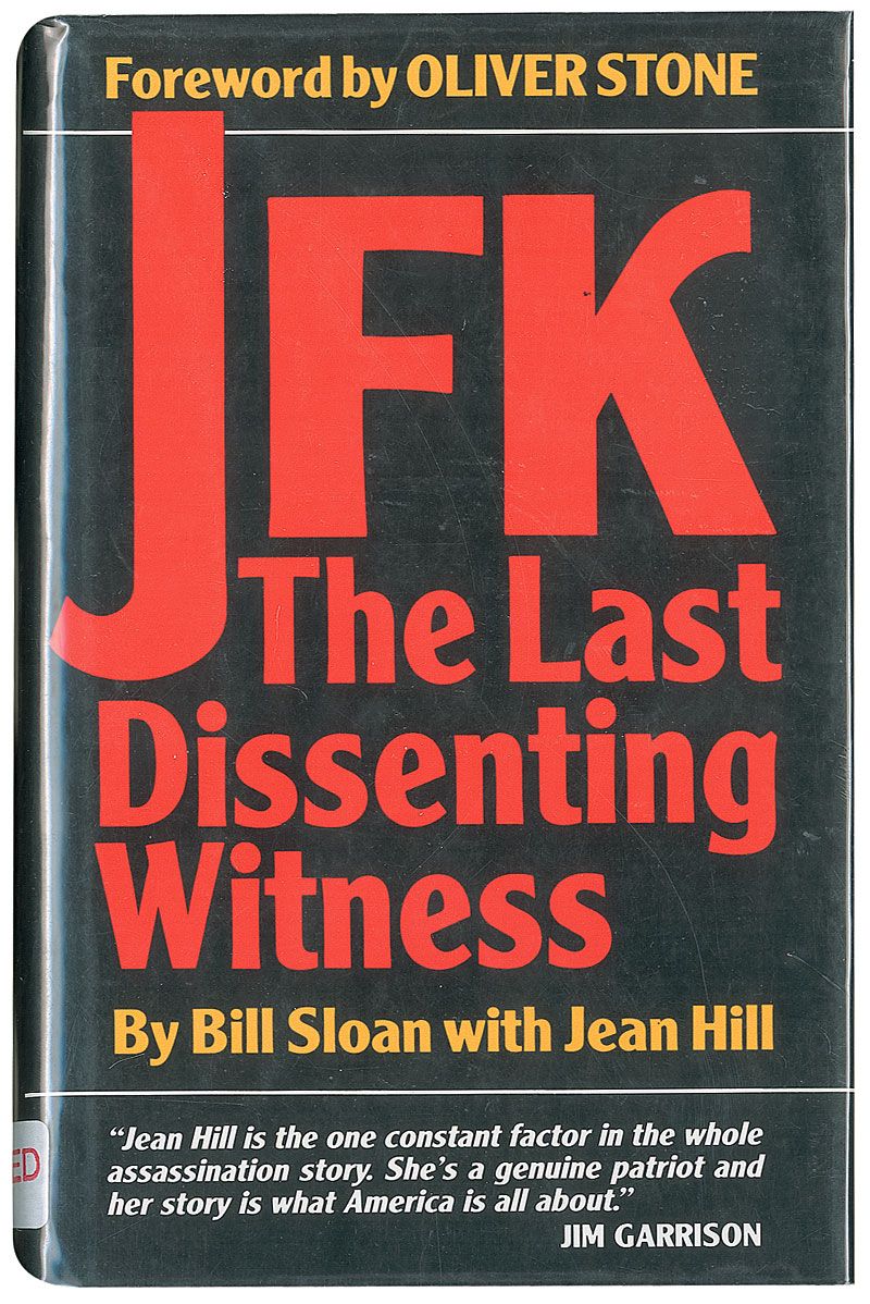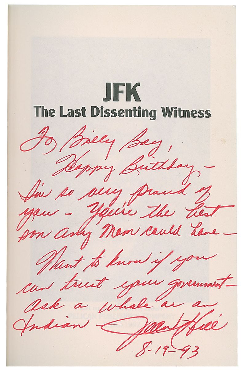 Signed book: JFK: The Last Dissenting Witness. First edition. Gretna, Louisiana: Pelican Publishing, 1992. Hardcover with dust jacket, 5.75 x 8.75, 255 pages. Signed and inscribed in red felt tip on the half-title page, “To Billy Boy, Happy birthday—I’m so very proud of you—You’re the best son any mom could have—Want to know if you can trust your government—as a whale or an Indian—Jean Hill 8-19-93,” and signed on the adjacent page in blue ballpoint by Bill Sloan and in blue felt tip by Oliver Stone. In fine condition.