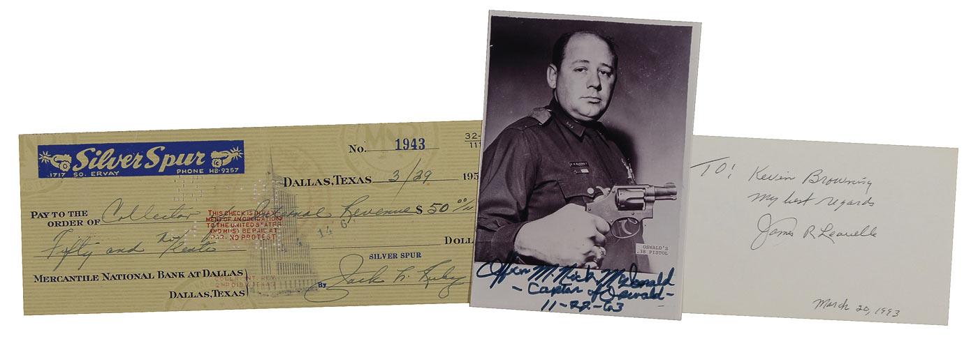 Three items: 8.25 x 3 business check, signed in blue fountain pen, “Jack L. Ruby”; 5 x 3 card, signed in black ballpoint, “To: Kevin Browning, My best regards, James R. Leavelle, March 20, 1993”; 3.5 x 5 glossy photo, signed in black fountain pen, “Officer M. Nick McDonald - Captor of Oswald - 11-22-63.” In overall fine condition, with vertical fold, trivial staple holes, and expected cancellation holes and stamps to the check. RRAuction COA.