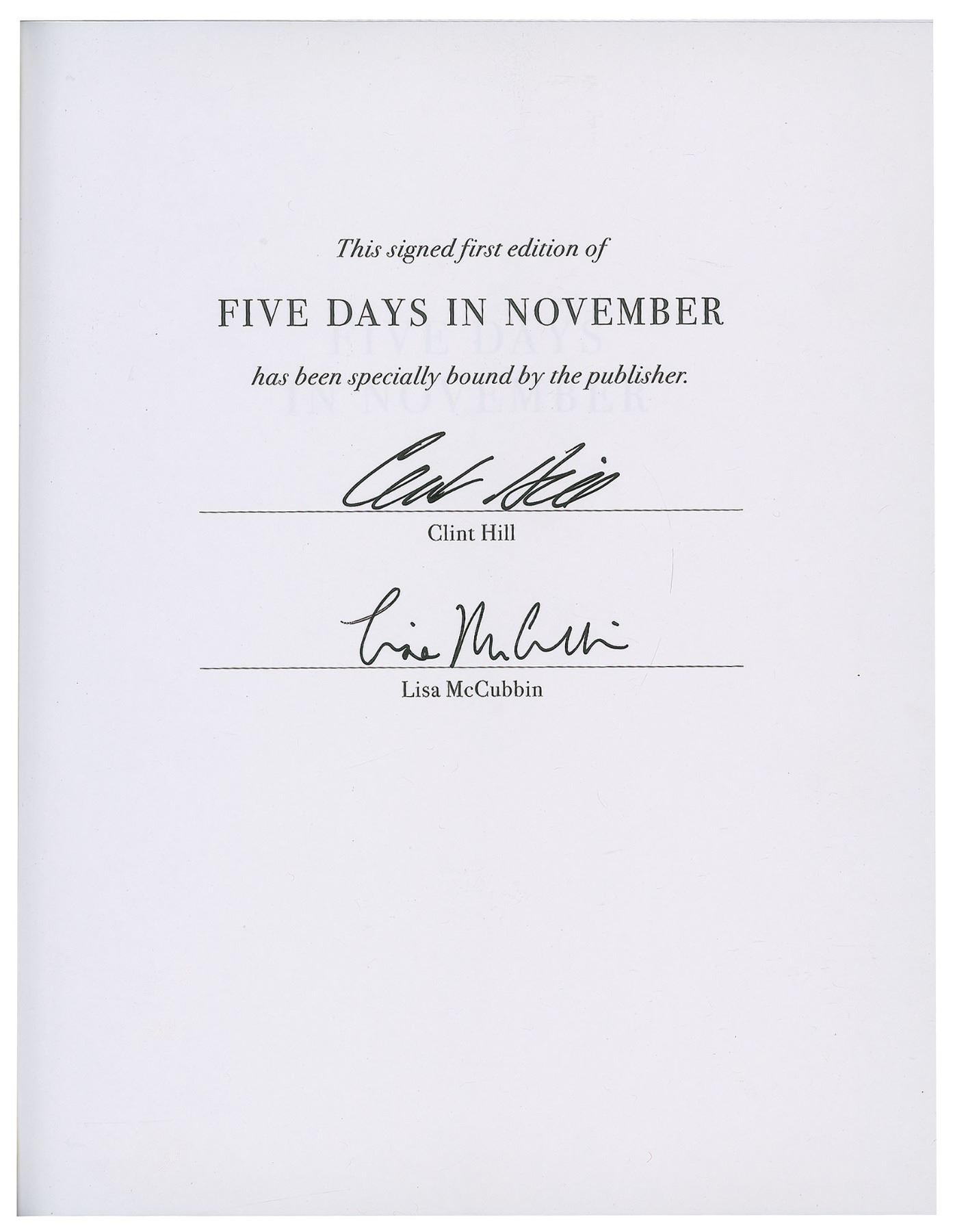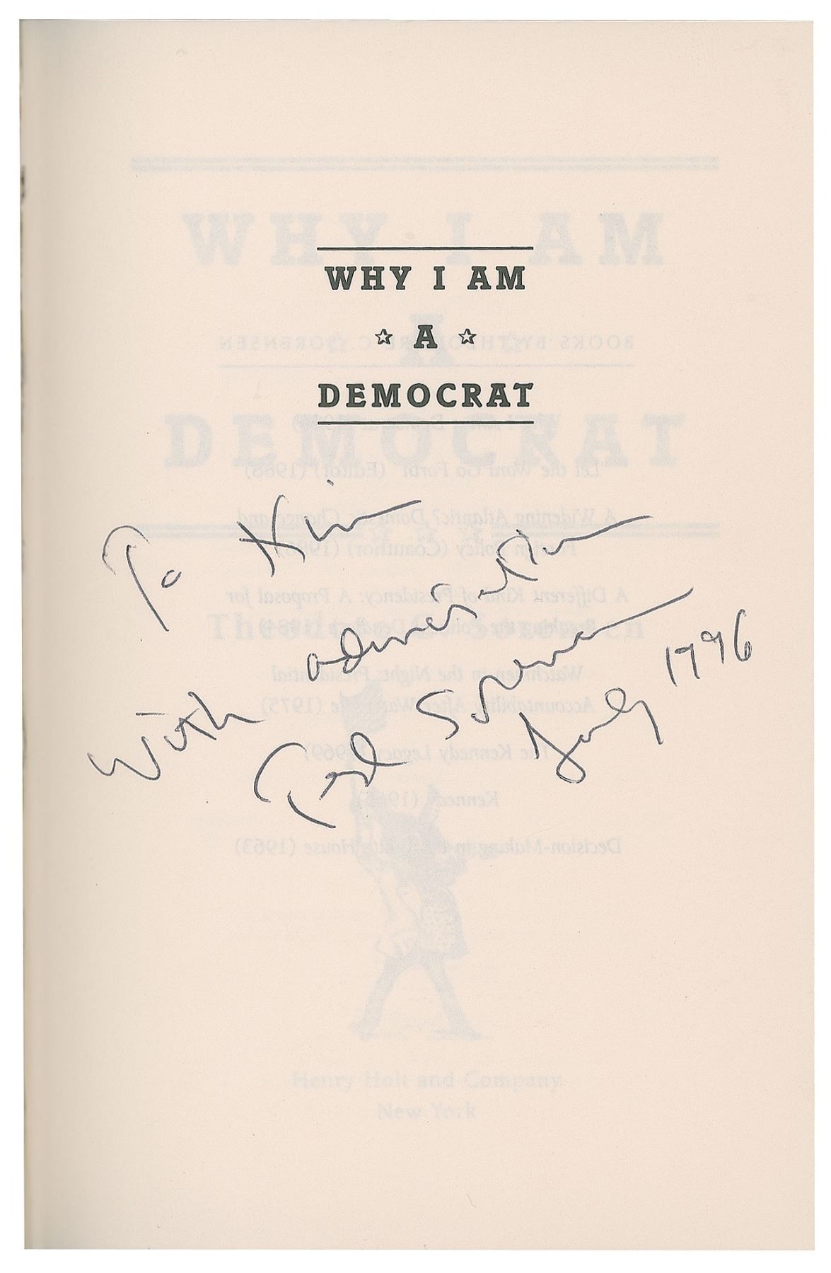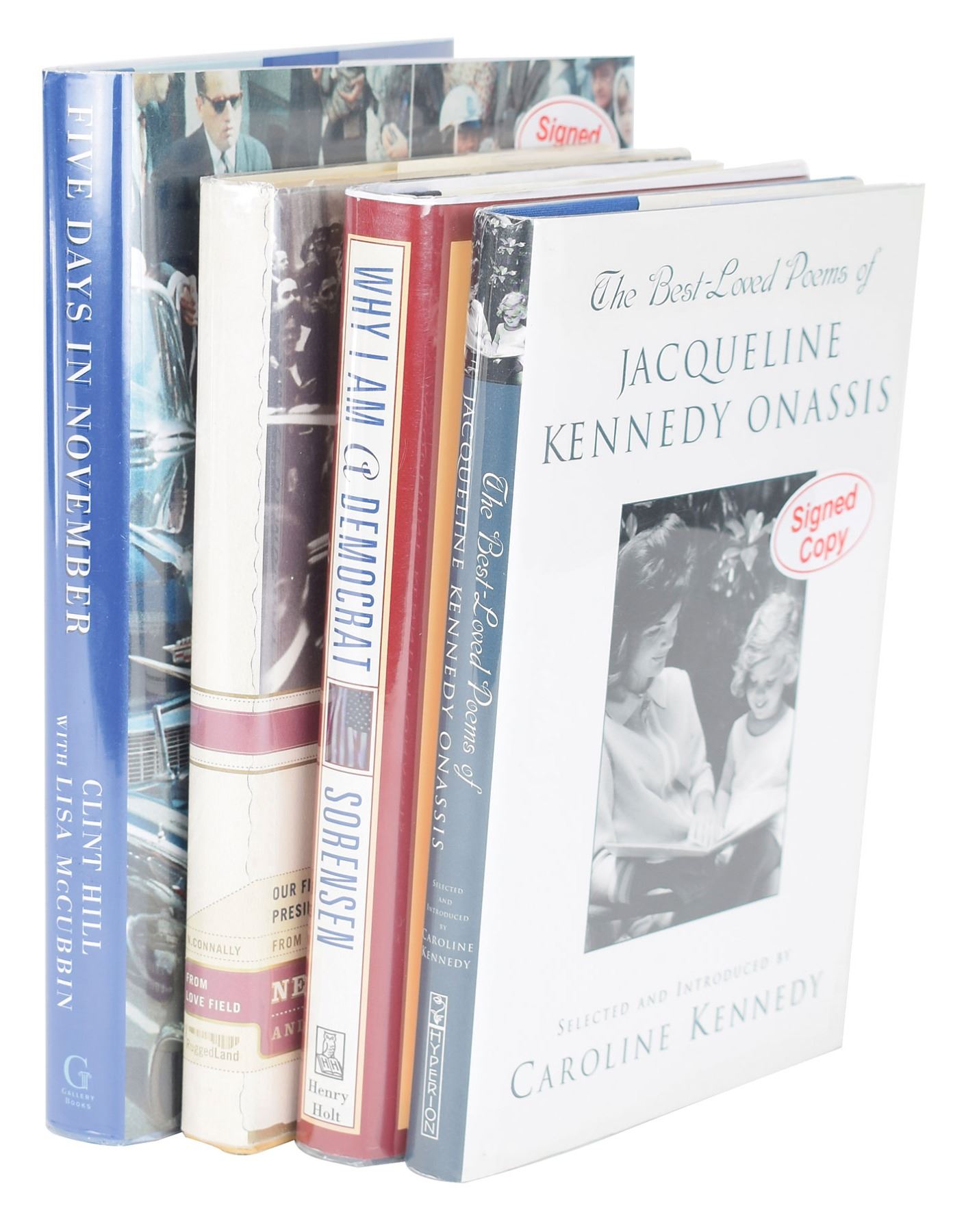 Four books signed by figures associated with John F. Kennedy, all hardcovers with dust jackets, including: Caroline Kennedy (The Best Loved Poems of Jacqueline Kennedy Onassis); Nellie Connally (Love Field); Theodore C. Sorensen (Why I Am a Democrat, inscribed); and Clint Hill and Lisa McCubbin (Five Days in November). In overall fine condition.