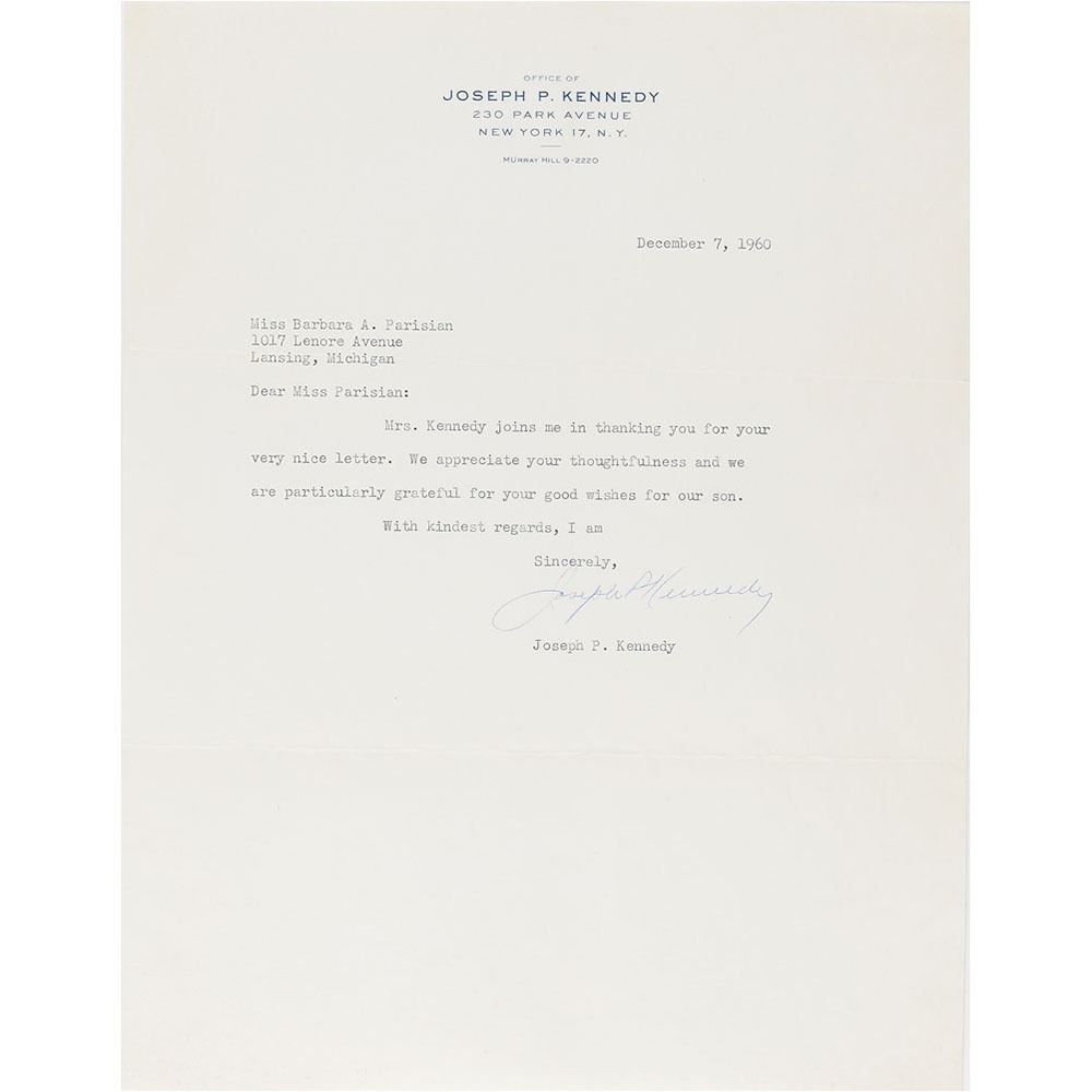 Patriarch of the fabled family of American politicians (1888–1969) who served as American ambassador to Great Britain from 1938 to 1940. TLS signed "Joseph P. Kennedy," one page, 8.5 x 11, personal letterhead, December 7, 1960. Letter to Barbara Parisian, in full: "Mrs. Kennedy joins me in thanking you for your very nice letter. We appreciate your thoughtfulness and we are particularly grateful for your good wishes for our son." In fine condition.