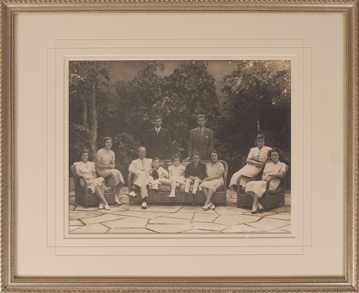 Outstanding original matte-finish 13 x 10 portrait of the Kennedy family circa 1938, showing them at their family estate in Palm Beach, Florida, with JFK seen next to his brother Joe, Jr., standing behind the couch. Nicely archivally matted and framed. In fine condition. An absolutely beautiful image capturing the essence of the powerful American family.