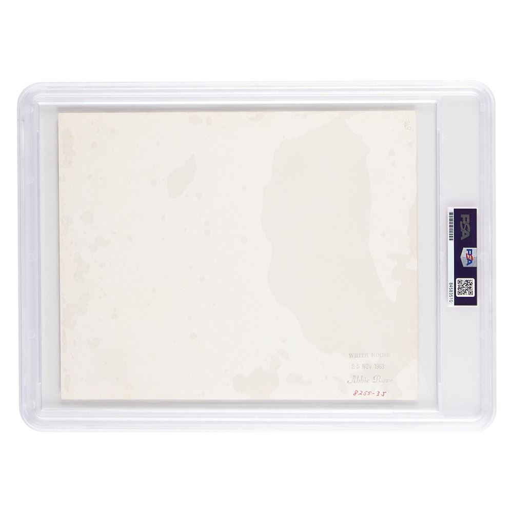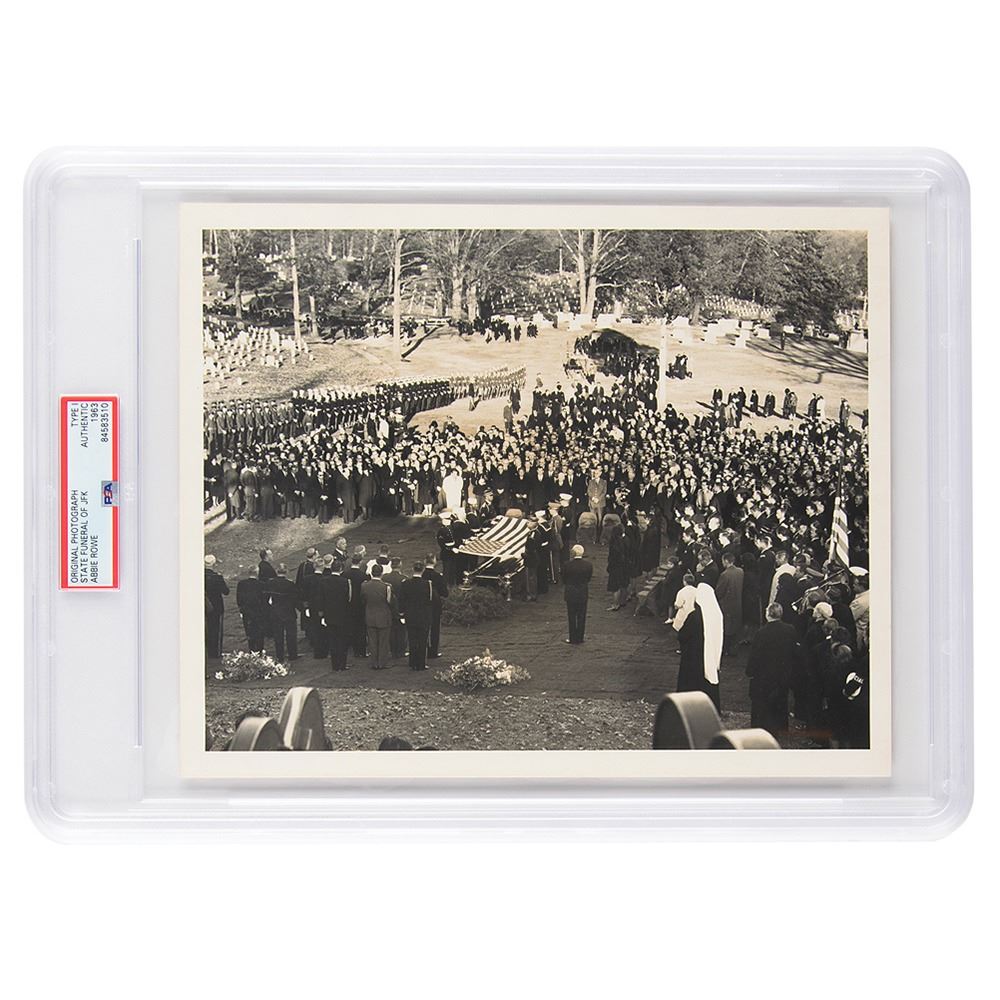 Original matte-finish 10 x 8 photo of the state funeral of President John F. Kennedy, depicting a large crowd at the burial, which was held at Arlington National Cemetery on November 25, 1963. Reverse bears an Abbie Rowe White House stamp, numbered “8255-3J.†In very fine condition. Encapsulated by PSA as an authentic 'Type I' photograph.