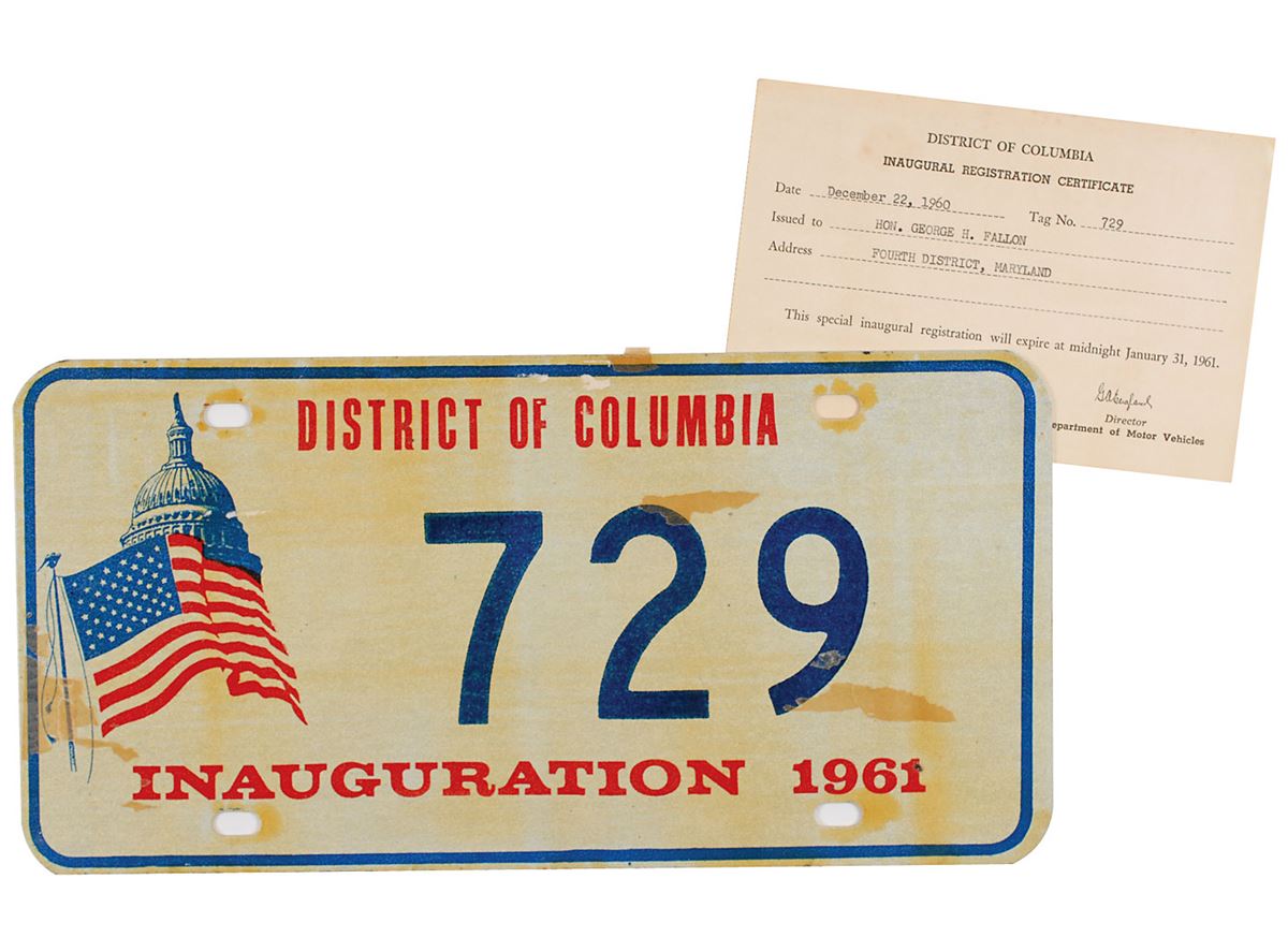 Pair of 1961 District of Columbia license plates issued to Congressman George Hyde Fallon for the 1961 inauguration of President John F. Kennedy, 12 x 6, number “729,” featuring a design of the American flag in front of the US Capitol. Includes the inaugural registration certificate stating that they were issued on December 22, 1960, to Hon George H. Fallon of the Fourth District, Maryland. Text at the bottom reads, “This special inaugural registration will expire at midnight January 31, 1961.” In overall very good condition, with toning and adhesive remnants to the plates.