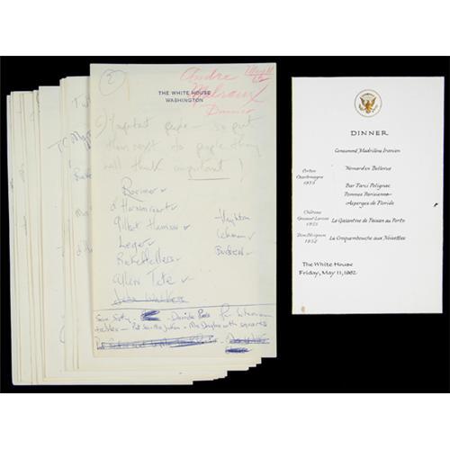 <Our item number 111086><B>Kennedy, Jacqueline.</B> (1929-94) As wife of President John F. Kennedy, her interest in the arts inspired national attention to culture and she made the White House a historical museum. Her courage after JFK's assassination inspired the nation. She later married Greek shipping magnate Aristotle Onassis and became a book editor for Doubleday.<BR><BR>Thirteen pages of handwritten notes on White House stationery regarding a dinner held Friday, May 11, 1962 at the White House in honor of Andre Malraux, renowned French author who was at that time the French Minister of Cultural Affairs. Guests included prominent politicians, as well as several well-known writers and artists, such as Thornton Wilder, Saul Bellow, Paddy Chayefsky, Agnes DeMille, Susan Strasberg, Tennessee Williams, Arthur Schlessinger, and Adam Clayton Powell. Her notes are fascinating: ".<I>.Important people - so put them next to people they will think important!…put Boudin next to quite stuffy ladies…but no one who will tell press what he does here (like that gossip Elena)…put someone who speaks French (Embassy, youngish) on her other side</I>…" Some pages have drawings of tables and the positioning of the guests. At a table with Mrs. Fulbright and Gilbert Harrison, she makes a note to place a "<I>smart woman</I>" next to Harrison, and adds, "<I>ask Arthur</I>." Vice President Lyndon Johnson's table has Agnes de Mille, Thornton Wilder, and Mrs. Lindberg among the guests and a table headed by "Eunice" (presumably Kennedy) has (Leonard) Bernstein listed as a guest. A three-page list of the guests is included, as is the menu from the dinner. <BR>Estimated Value $10,000-12,500. <BR><BR>Our item number 111086<BR><IMAGES><P ALIGN="CENTER"><IMG SRC="http://64.60.141.195/photos/40jpegs/111086.jpg"> </P></IMAGES>
