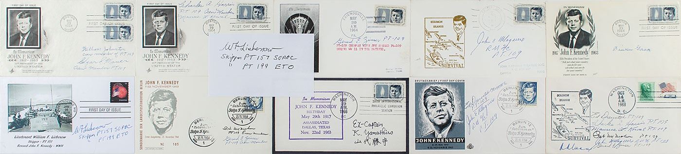 Collection of 11 items signed by crewmen associated with the PT-109 incident and the captain of the Japanese destroyer Amagiri that rammed it, consisting almost entirely of commemorative covers, highlighted by several multi-signed covers. Signers are: Katsumori Yamashiro; Ed Drewitch and John E. Maguire; Patrick Henry McMahon and Gerard Zinser; William Liebenow (FDC and signature); Charles A. Harris and Maurice Kowal; William Johnston and Edgar E. Mauer; Gerard Zinser; John E. Maguire; Biuku Gasa; and Ed Drewitch, Charles A. Harris, Maurice Kowal, Pat McMahon, John E. Maguire, Gerard Zinser, and one other. In overall fine condition.