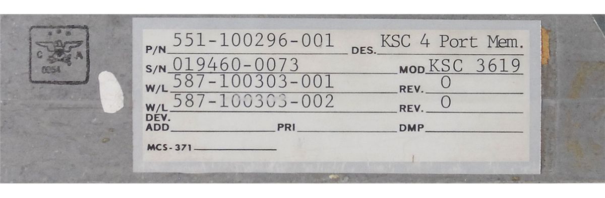 Kennedy Space Center memory port. Board measures approximately 17 x 16.5 and retains its components and circuitry. Label affixed to one edge reads, in part: “Des. KSC 4 Port Mem, S/N 019460-0073, Mod. KSC 3619.” Another edge bears a “Burned In” stamp. In fine condition.